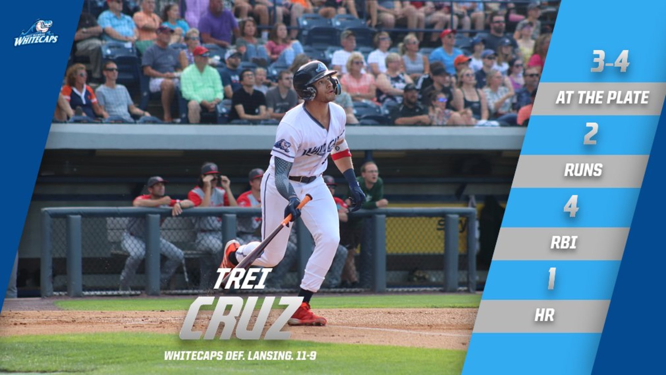 LANSING, MI – Trei Cruz’s three-run homer highlighted a seven-run sixth inning as the West Michigan Whitecaps hung on to defeat the Lansing Lugnuts by a score of 11-9 win in front of 7,776 fans on Friday at Jackson Field.