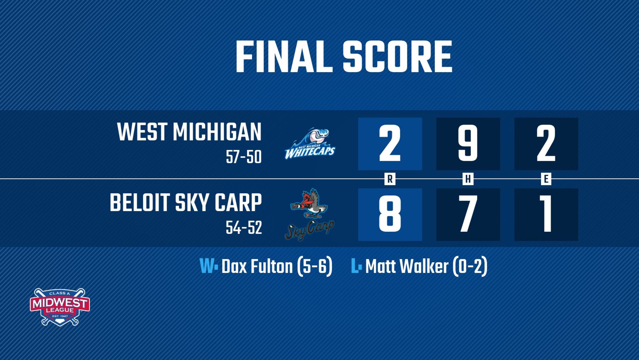 The Whitecaps record falls to 57-50 and 26-15 in the second half. The Sky Carp elevate to 23-18 and 54-52 overall. Dax Fulton (5-6) tossed five scoreless frames while striking out four in collecting his fifth win of the season, while lefty Matt Walker (0-2) gave up just one run in the first two innings of the contest to suffer his second loss. Third baseman Jose King led West Michigan with its only multi-hit game and turned an unassisted double play in the loss. The Whitecaps have lost five of their last six games for the first time since early May.