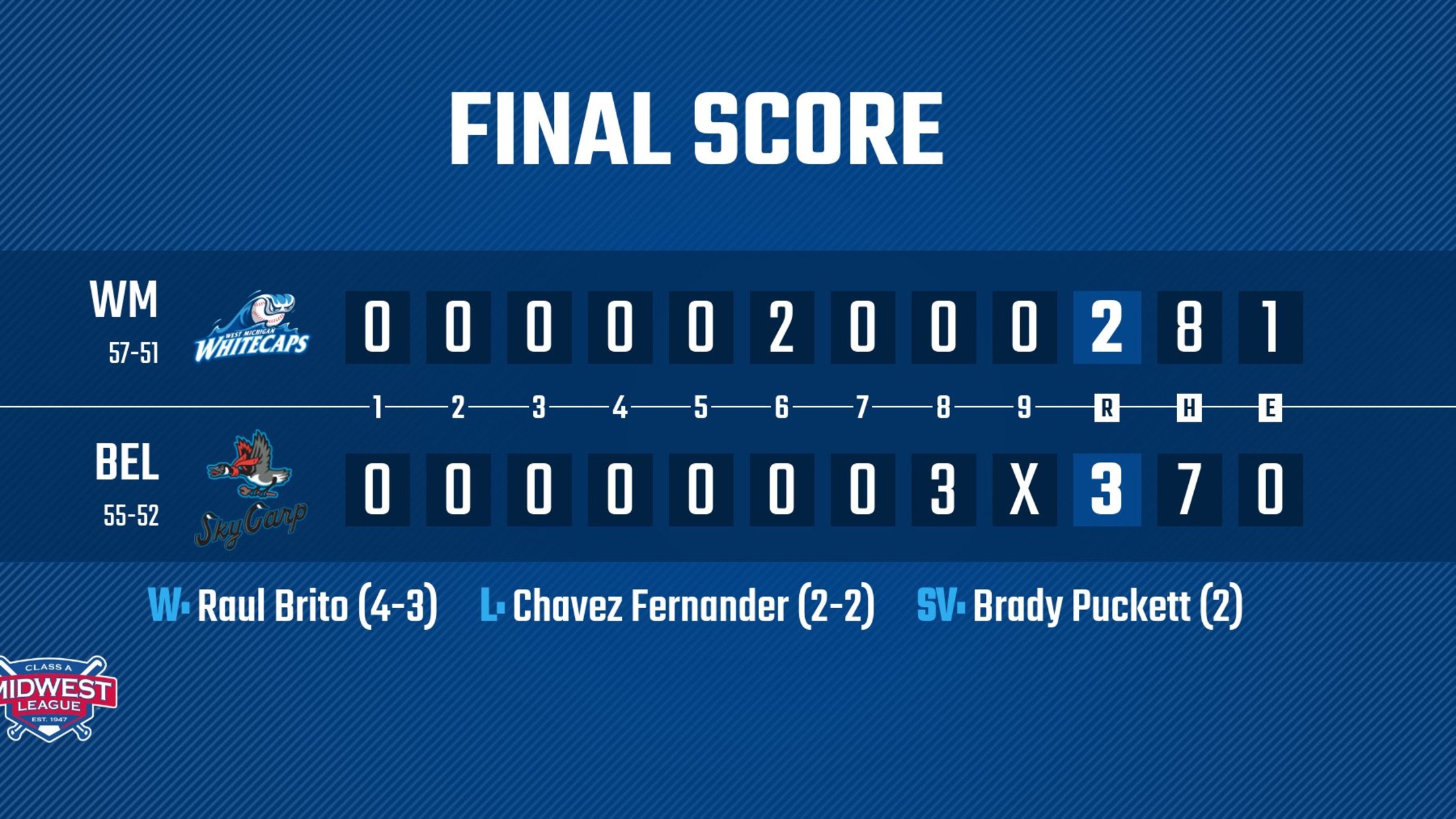 The Whitecaps record falls to 57-51 and 26-16 in the second half. The Sky Carp elevate to 24-18 and 55-52 overall. Raul Brito (4-3) earns the win in relief – his fourth of the season, while Fernander (2-2) takes his second loss. Brady Puckett collects his second save of the season by tossing a scoreless ninth. Mendoza went 3-for-4 at the plate, his third three-hit performance of the season, in a losing cause.