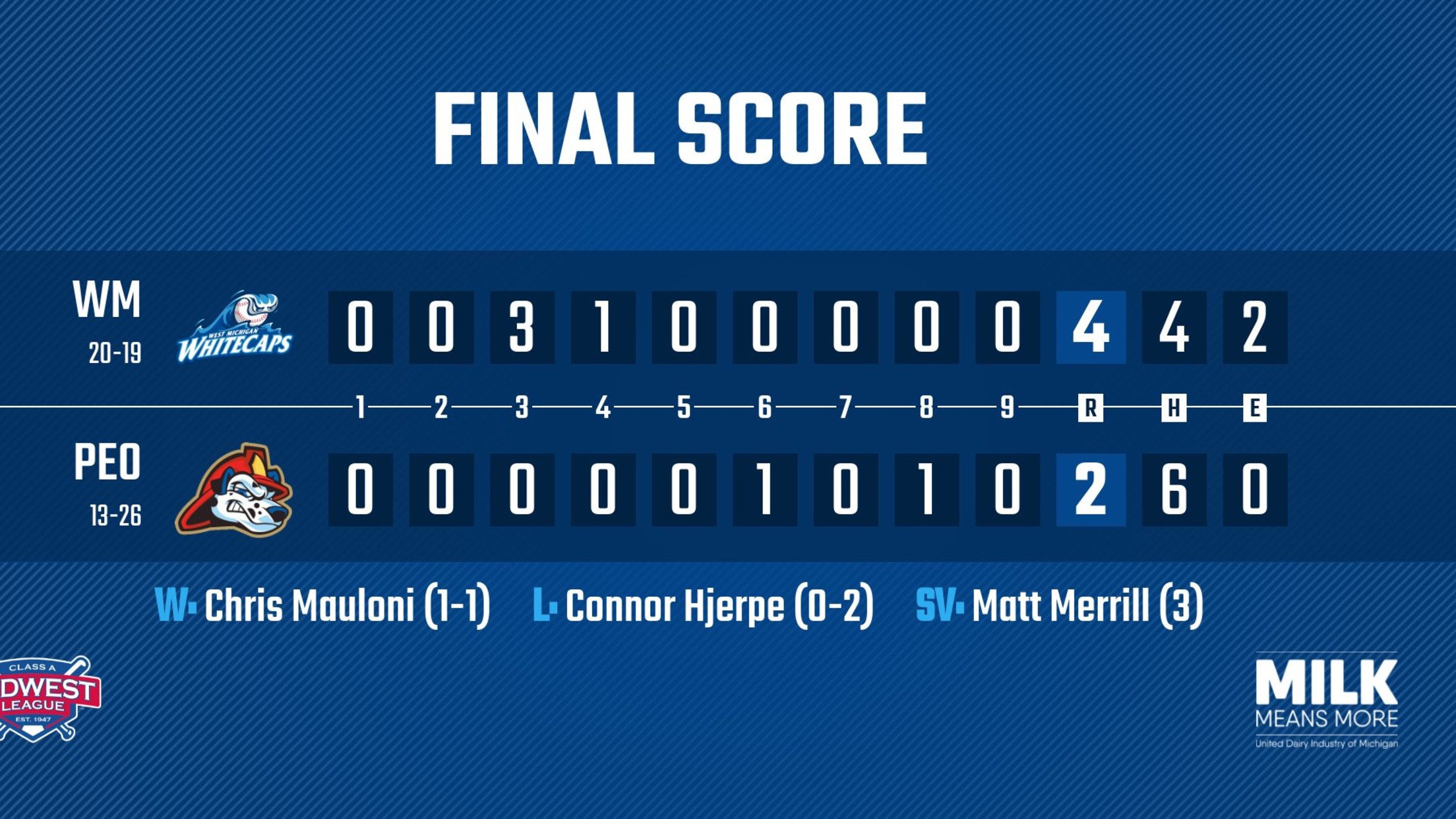 Sunday’s contest saw a pitching rematch of Tuesday’s 1-0 Chiefs victory, with Colin Fields and Connor Hjerpe on the mound for West Michigan and Peoria, respectively. Both pitchers locked in early, and the game remained scoreless until the third when Luke Gold launched a three-run homer, his ninth of the season, to open the scoring and give the ‘Caps a 3-0 lead. Peyton Graham jumped all over the first pitch of the fourth inning to extend the lead to 4-0 with his first Whitecaps homer. The score remained the same until the sixth when Won Bin Cho’s RBI-double gave Peoria their first run before Darlin Moquete blasted his first home run of the season to bring the score to 4-2, but ‘Caps pitcher Matt Merrill came on and tossed a perfect ninth inning to earn his third save and send West Michigan into a series at first-place Lake County next week just two games out of first place.
