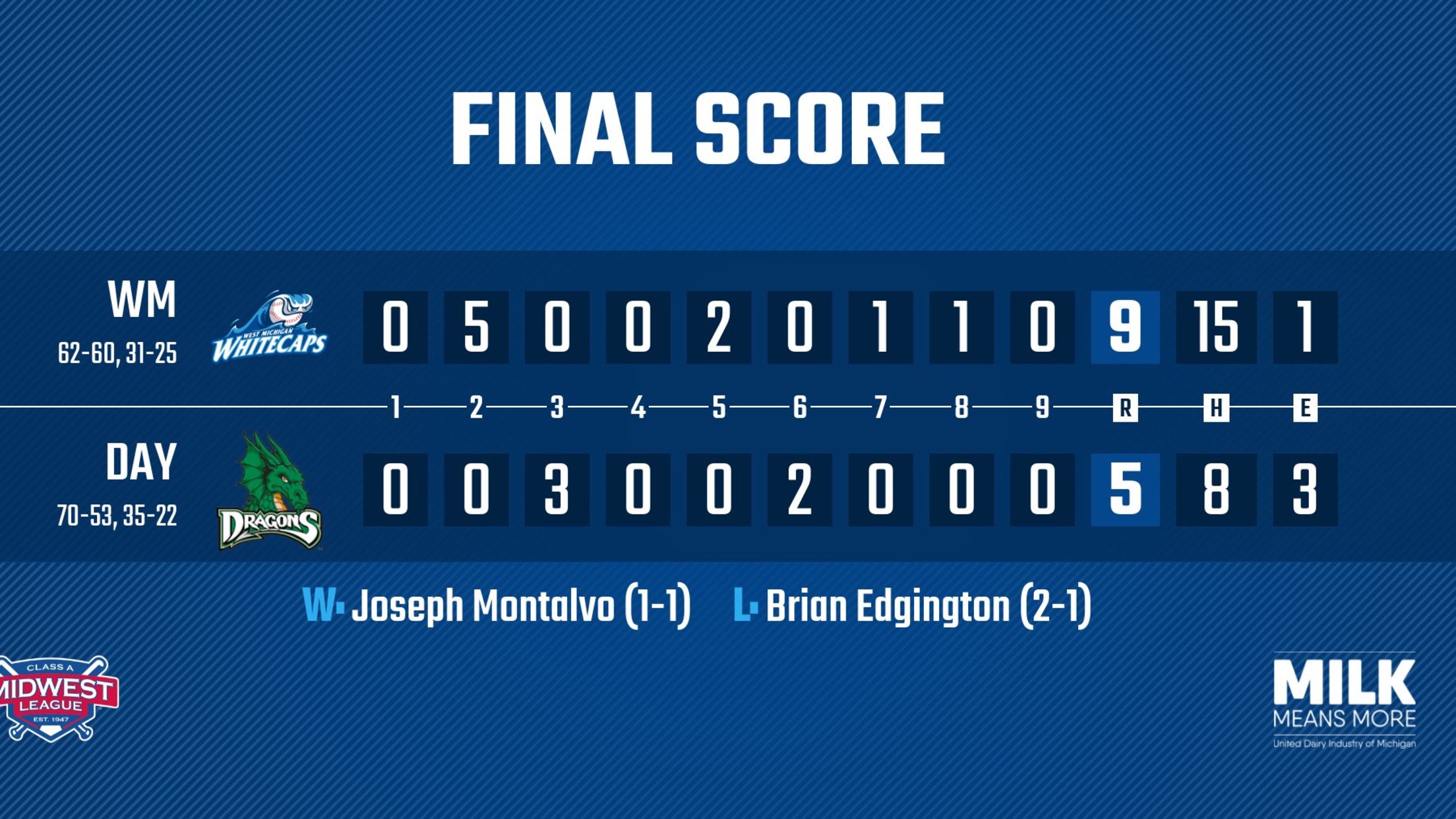 The Whitecaps improve to 31-25 in the second half and keep their overall record over .500 at 62-60. Detroit Tigers Top-20 prospect Joseph Montalvo (1-1) tossed five innings and allowed three runs in earning his first victory as a Whitecap, while Dragons starter Brian Edgington (2-1) gave up seven runs in five frames in taking his first loss. Peck, Izaac Pacheco, and Seth Stephenson each collected three hits to pace West Michigan’s 15-hit attack.