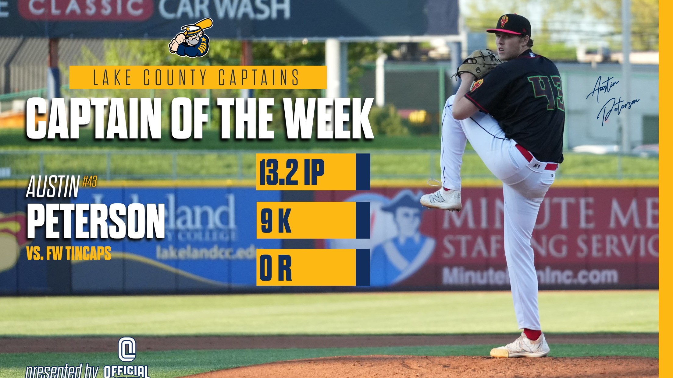 EASTLAKE, OH – After each series this season, the Lake County Captains will spotlight a Captain of the Week, presented by Official League, showcasing a player and their strong performance over the previous week. For the week of April 30 through May 5, Lake County is recognizing RHP Austin Peterson