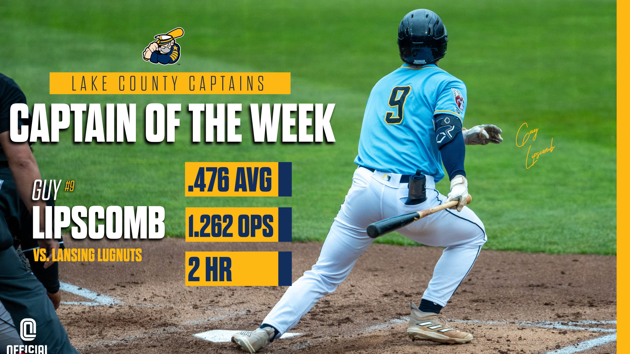 EASTLAKE, OH – After each series this season, the Lake County Captains will spotlight a Captain of the Week, presented by Official League, showcasing a player and their strong performance over the previous week. For the week of May 14 through 19, Lake County is recognizing OF Guy Lipscomb as