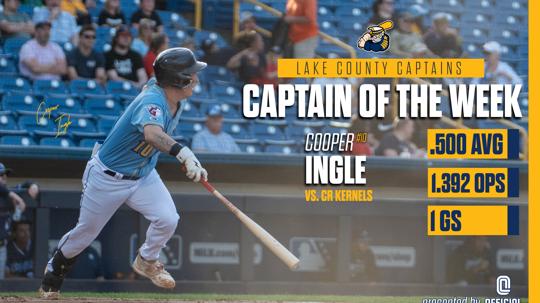 EASTLAKE, OH – After each series this season, the Lake County Captains will spotlight a Captain of the Week, presented by Official League, showcasing a player and their strong performance over the previous week. For the week of May 28 through June 2, Lake County is recognizing C Cooper Ingle