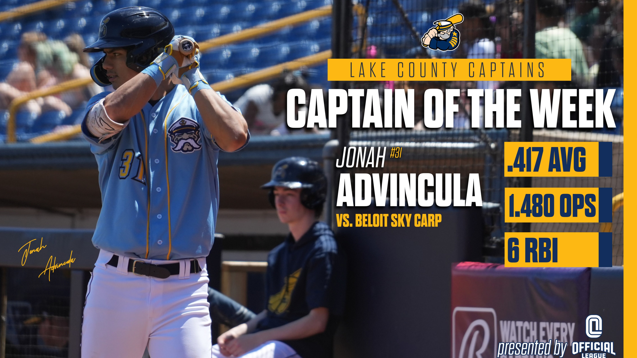 EASTLAKE, OH – After each series this season, the Lake County Captains will spotlight a Captain of the Week, presented by Official League, showcasing a player and their strong performance over the previous week. For the week of June 4 through 9, Lake County is recognizing OF Jonah Advincula as