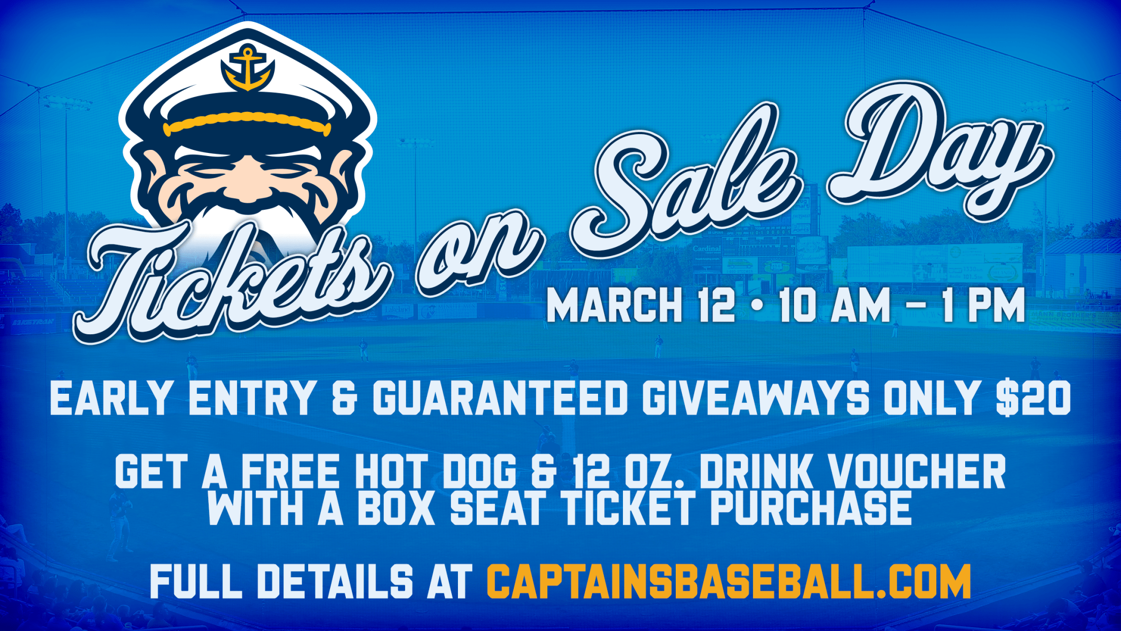 Season ticket holders who stop by Classic Park on March 12 to pick up their ticket packages will also receive a free, limited-edition Captains can koozie. Season Ticket and Holiday Package Holders can also purchase guaranteed giveaway passes on this day for a $10 upgrade.