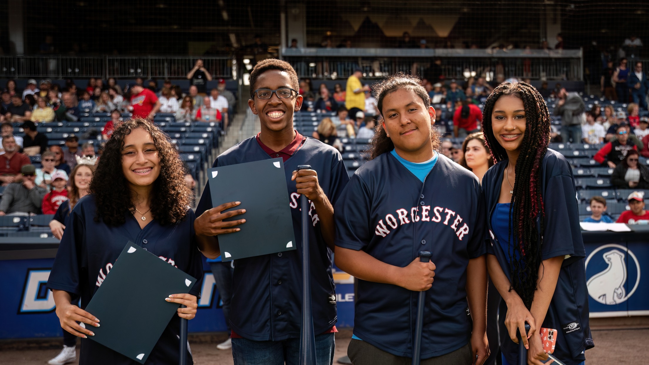 Right before Worcester’s opener of a twin bill with Rochester on Saturday, four Worcester Public Schools eighth graders were announced as the WooSox Scholars “Class of 2023.”