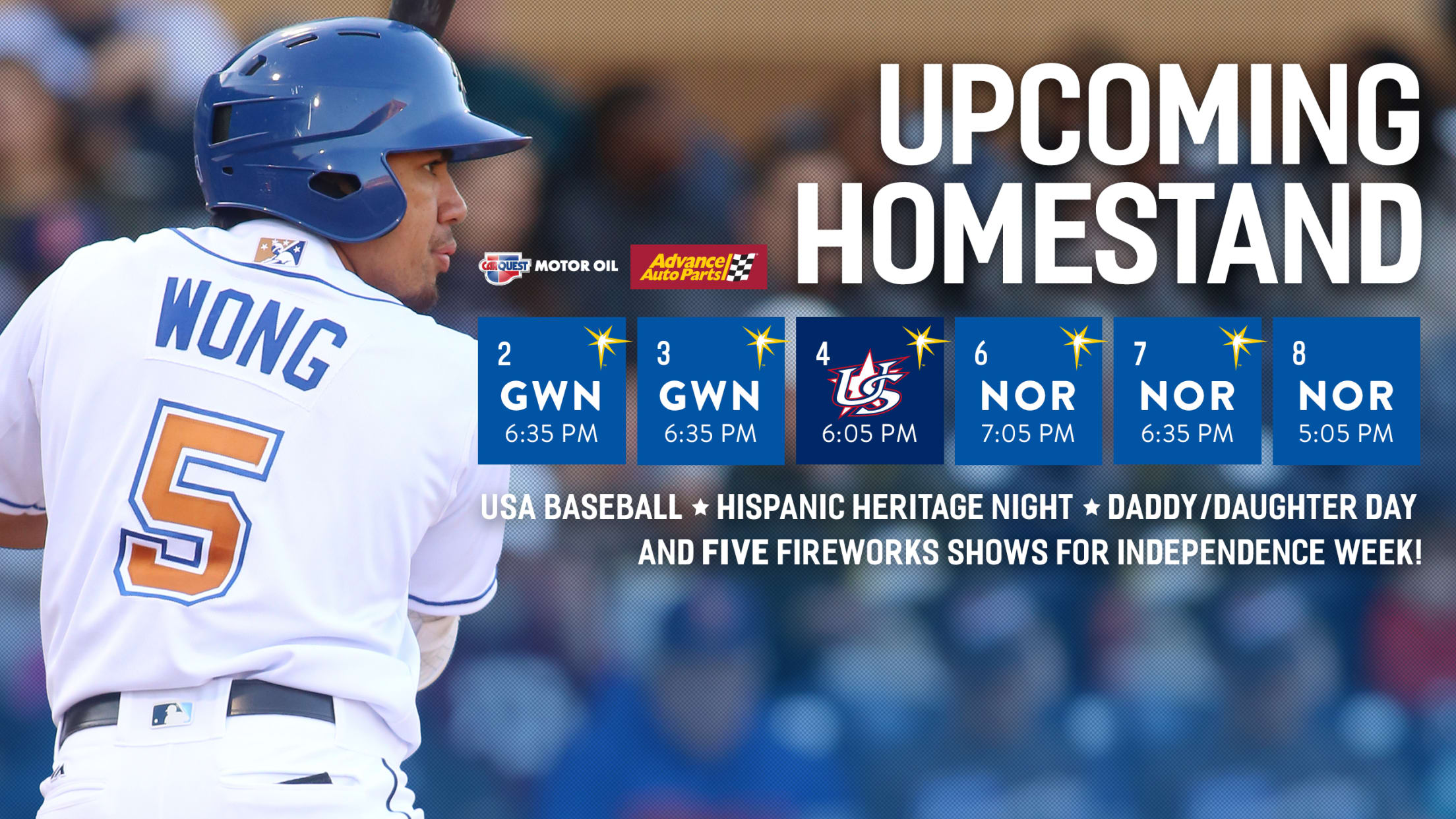 The Durham Bulls will play five games in seven days at the DBAP beginning Monday, July 2, and USA Baseball will take on Japan on the 4th of July. Five fireworks shows highlight Independence Week, along with Hispanic Heritage Night, Food Truck Friday and Daddy/Daughter Day.The week begins Monday, July