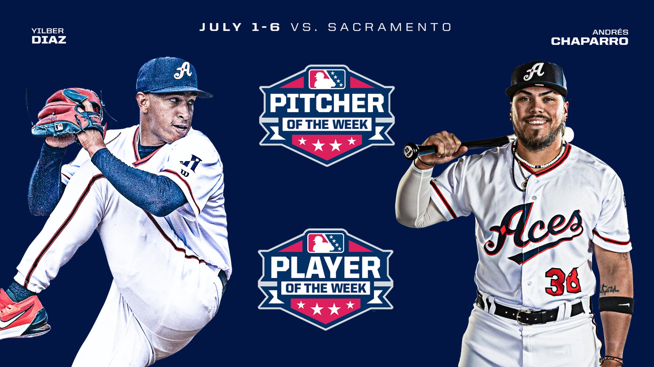 Reno, Nev. – Following outstanding performances at the plate and on the mound during the Reno Aces six-game sweep against the Sacramento River Cats, infielder Andres Chaparro and starting pitcher Yilber Diaz were named Pacific Coast League Player and Pitcher of the Week, as announced by Minor League Baseball on Monday.