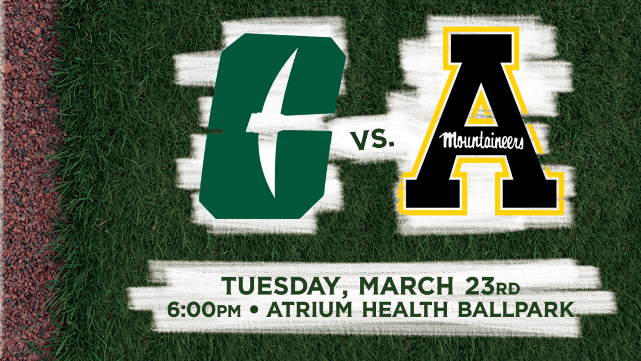(KANNAPOLIS, NC) – Almost a year from the date of the original first pitch, Atrium Health Ballpark will debut as a baseball field for the first time when the Charlotte 49ers welcome the Appalachian State Mountaineers in a Division I, non-conference match-up on Tuesday, March 23 at 6:00 p.m.