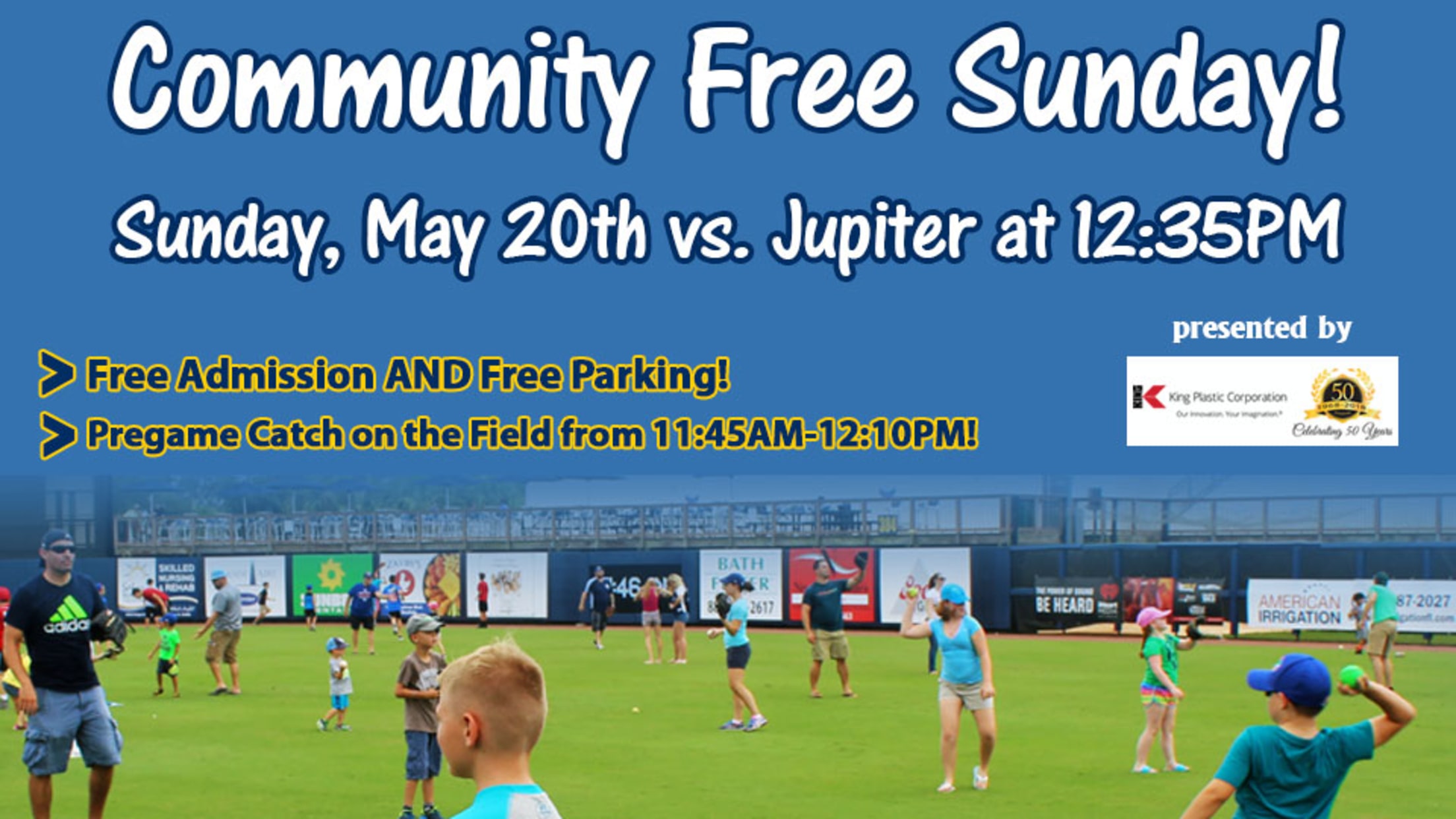 Sunday home games are Community Free Sundays presented by King Plastic Corporation! Admission and parking are free for everyone. Come out to the ballpark Sunday, May 20th to watch the Stone Crabs play the Jupiter Hammerheads at 12:35 p.m. Gates will open at 11:30 a.m. and we'll have Family Catch in the Outfield from 11:45 a.m. - 12:15 p.m.