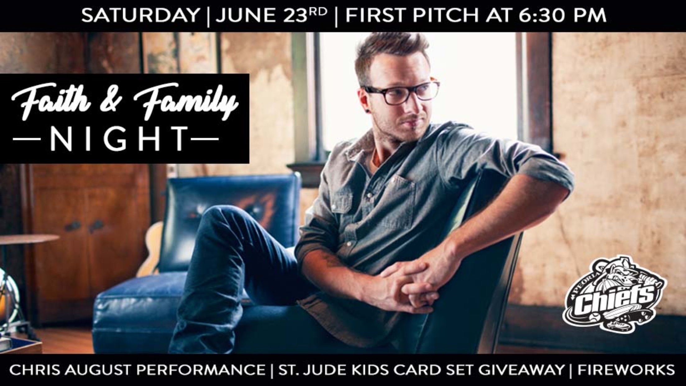 Peoria, IL - The Peoria Chiefs have announced that Contemporary Christian music star Chris August will return to Dozer Park to perform after the Saturday, June 23 game as part of Faith & Family Night. August performed at Dozer Park on June 18, 2016 in front of nearly 6000 fans after