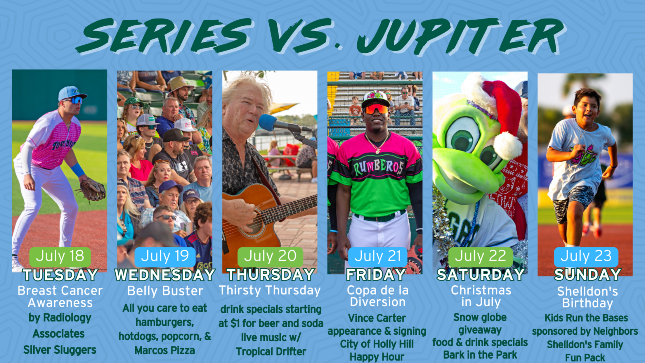 DAYTONA BEACH, Fla.—The Daytona Tortugas remain home at Jackie Robinson Ballpark for a stretch of six games during their return from the All-Star Break. On Tuesday, July 18th, the Jupiter Hammerheads, the Florida State League affiliate of the Miami Marlins, will come to town. Among the highlights of the six
