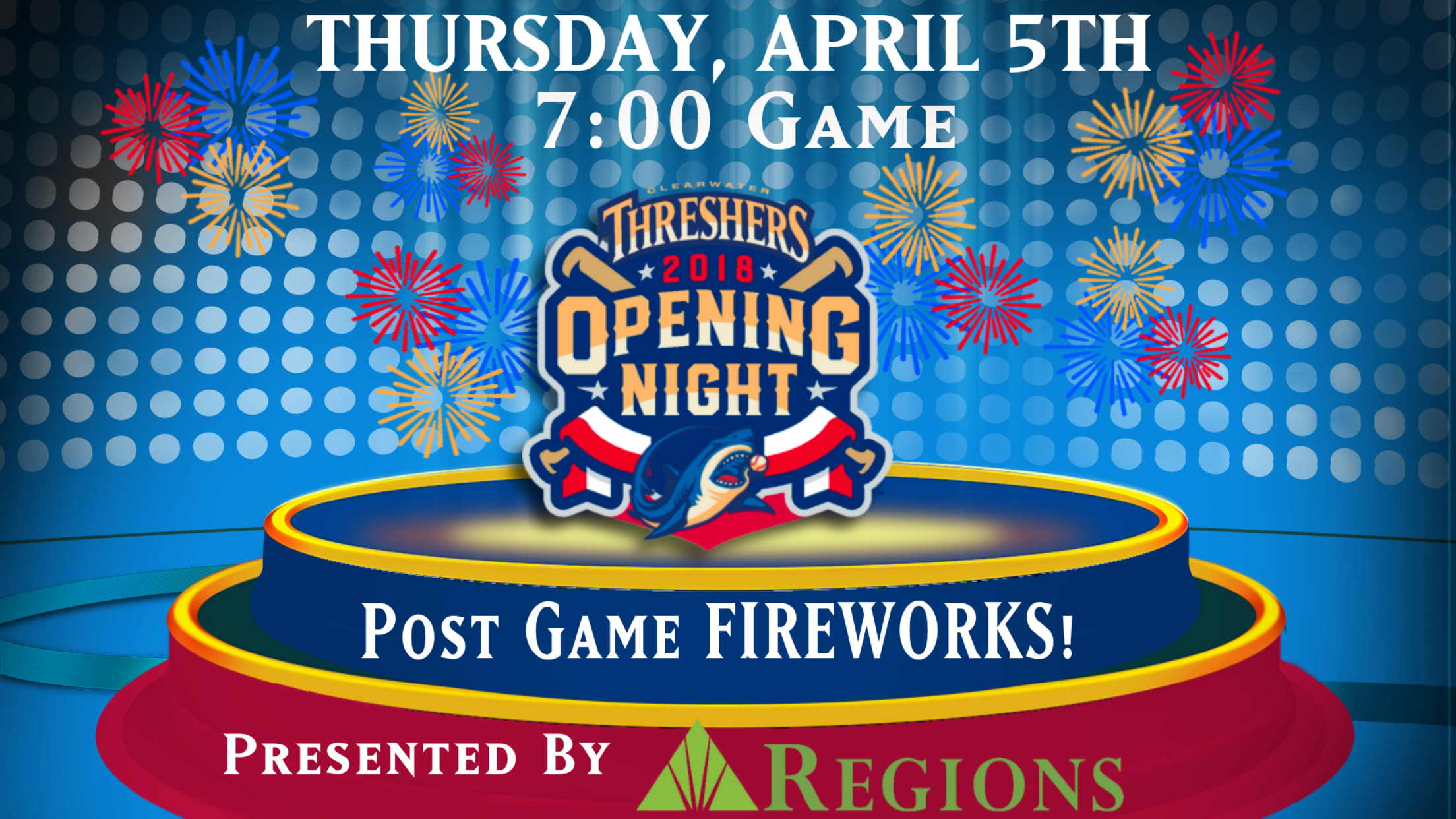 CLEARWATER, Florida - Threshers Opening Night by Regions Bank is April 5 at Spectrum Field. Clearwater blasts off the season at home with two nights of fireworks.