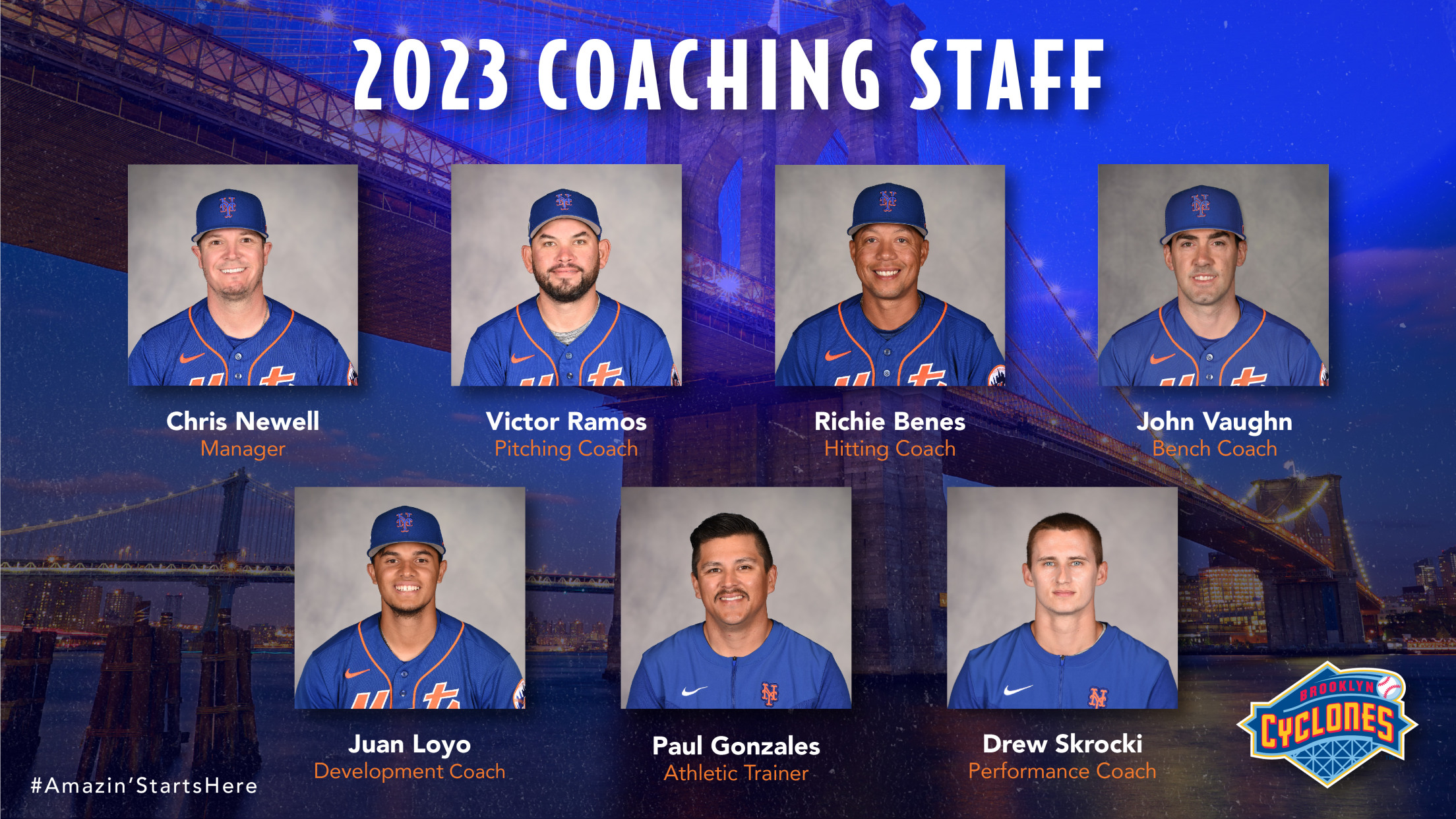 BROOKLYN, NY – February 13, 2023 – The New York Mets today announced the coaching staff for the 2023 Brooklyn Cyclones. Chris Newell, who served as the bench coach on manager Luis Rivera’s staff in 2022, will be the 14th manager in franchise history when the season opens on Friday,