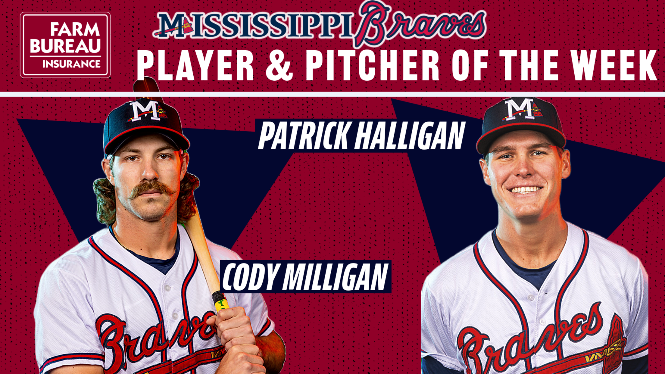 PEARL, MS (April 29, 2024) — The Mississippi Braves and Farm Bureau proudly announce that OF Cody Milligan and RHP Patrick Halligan have been named Farm Bureau Player and Pitcher of the Week for April 23-28.