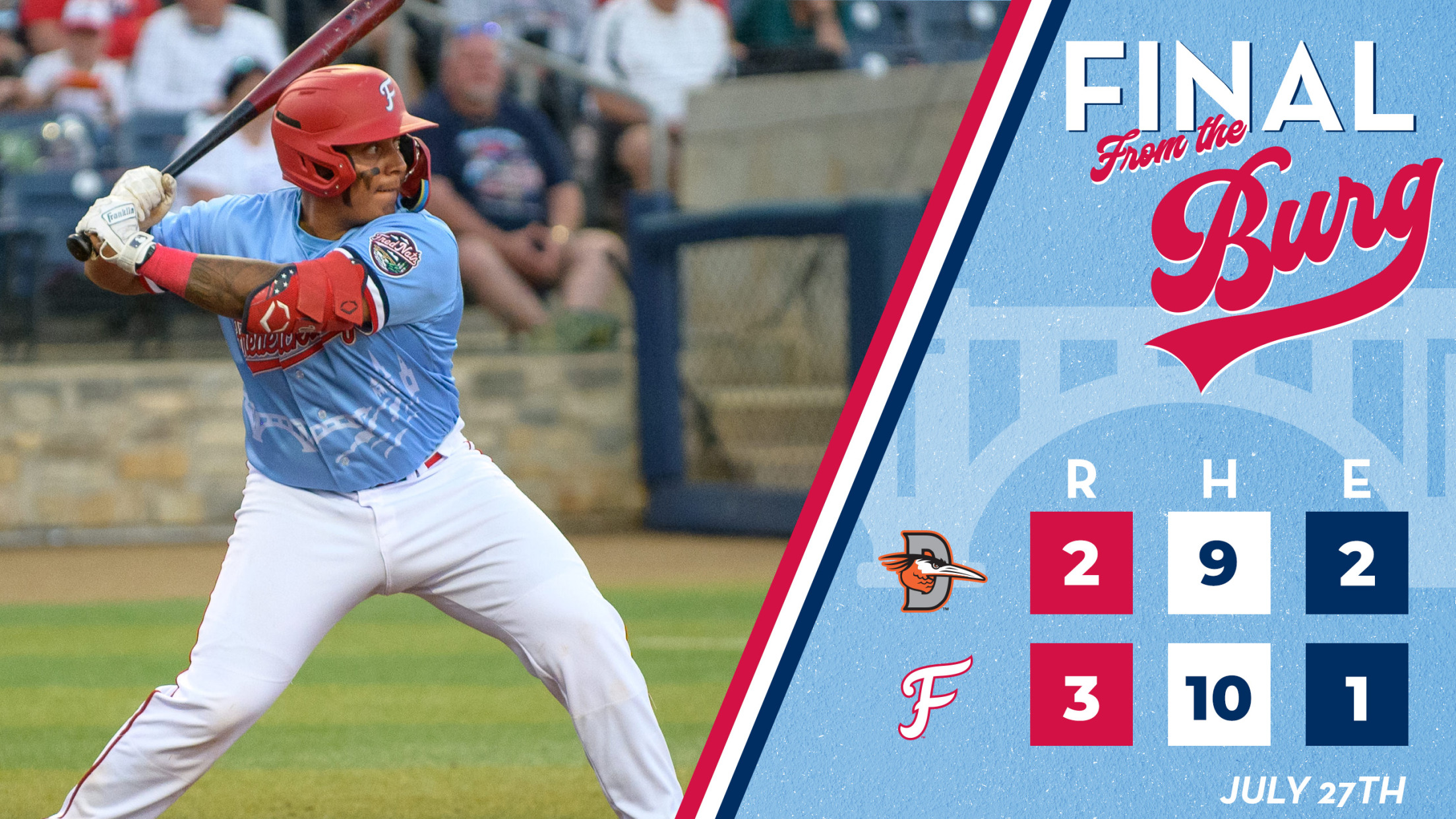 FREDERICKSBURG, VA - Jose Colmenares was the walk off hero for the Freddies on Harry Potter night, to secure a 3-2 win in 11 innings. The Nats are now 20-9 (55-40), while Delmarva drops to 12-17 (35-59).