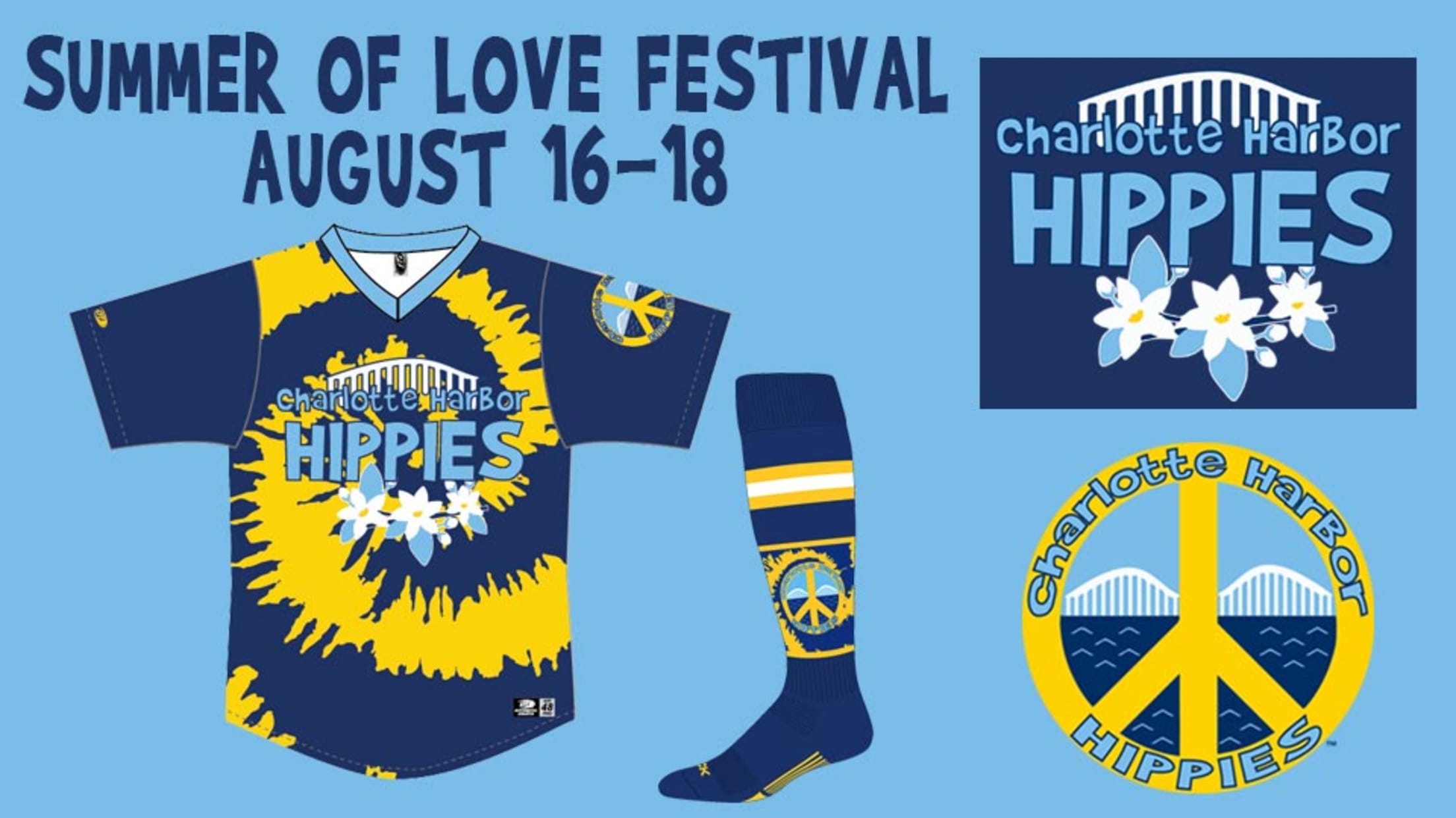 The jerseys will feature navy and gold tie dye and a new team logo that pays homage to the iconic bridges that connect Port Charlotte and Punta Gorda. This main logo also includes orange blossoms, the state flower of Florida. On the sleeve of the jersey is an alternate logo featuring the bridges, water and horizon of Charlotte Harbor framed by a gold peace sign.