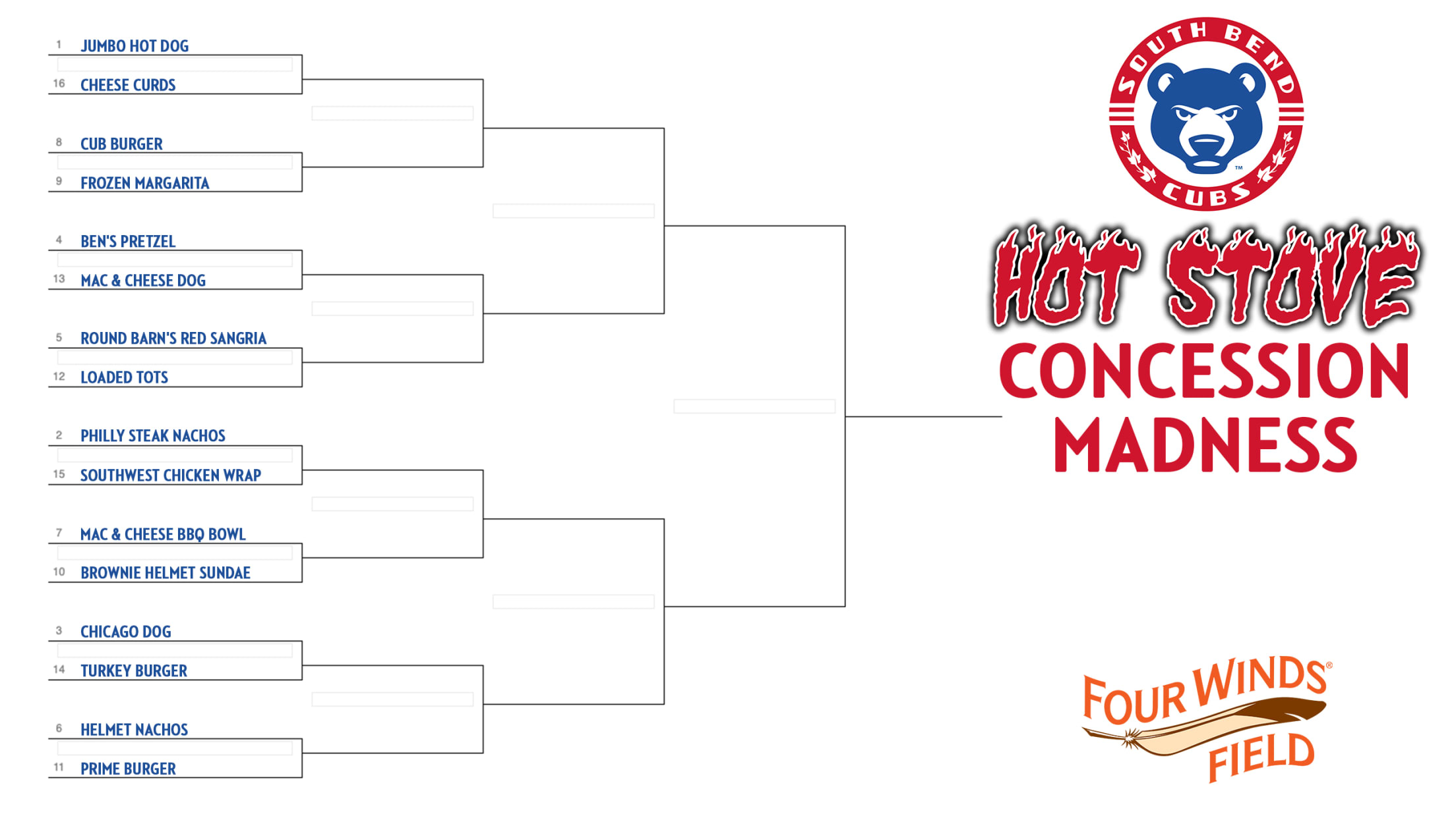 SOUTH BEND, IN – Fans looking to fill out their March brackets need to look no further. The Hot Stove Concession Madness Tournament puts 16 of the top concession items at Four Winds Field, home of the South Bend Cubs, against each other in social media fan voting to crown