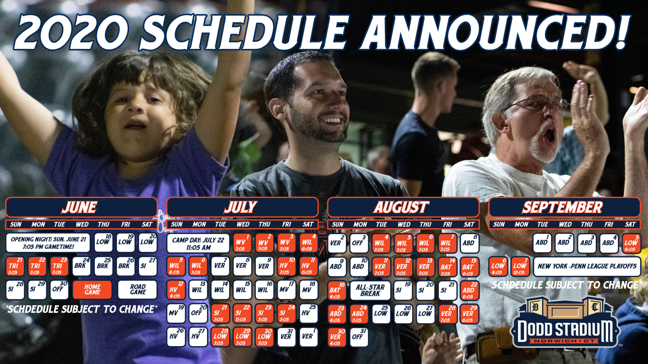 The team will play six Friday night home games during the summer of 2020, as well as six Saturdays and seven Sundays. There will be six home games against the Boston Red Sox affiliate the Lowell Spinners (July 28-30, September 5-7), four versus the New York Yankees affiliate the Staten Island Yankees (July 21-24).