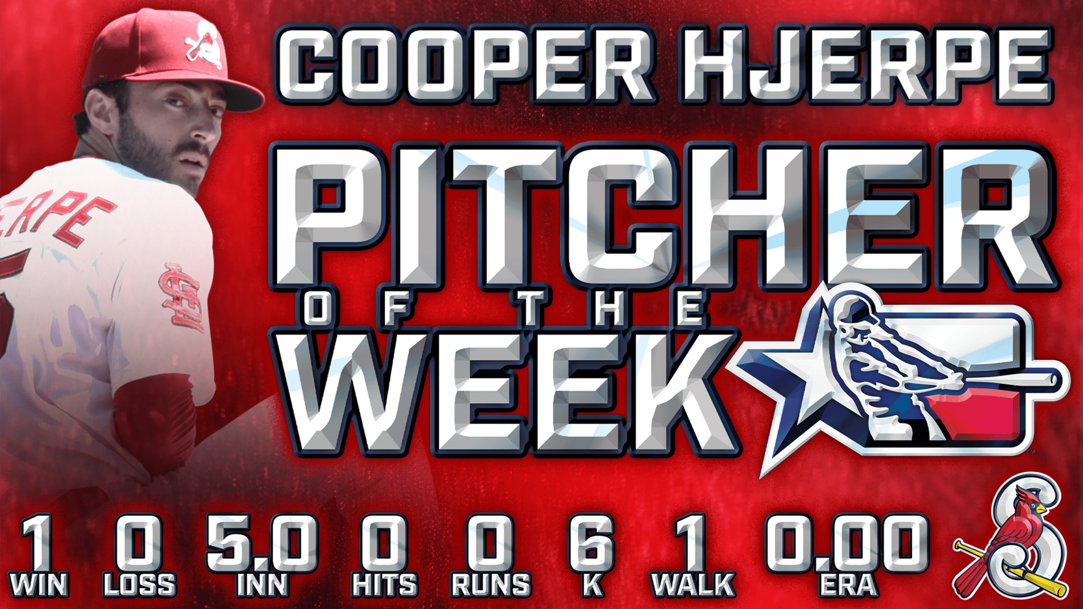 SPRINGFIELD, MO (June 24, 2024) - Minor League Baseball announced on Monday that Springfield Cardinals starting pitcher Cooper Hjerpe has been named the Texas League Pitcher of the Week for the week of June 17 - 23. He is the second Cardinal this season to win a weekly award, joining