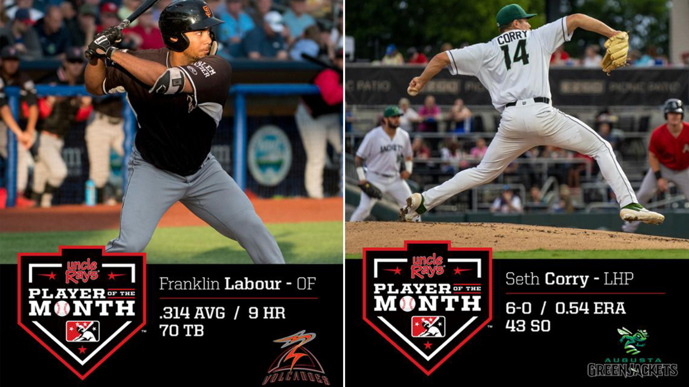 NORTH AUGUSTA, SC: Minor League Baseball has announced that Augusta GreenJackets starting pitcher, Seth Corry, and new GreenJackets outfielder, Franklin Labour, have been named the Uncle Ray's Players of the Month for July. Corry went 6-0 and posted an ERA of 0.54 in July, while Franklin Labour was promoted to
