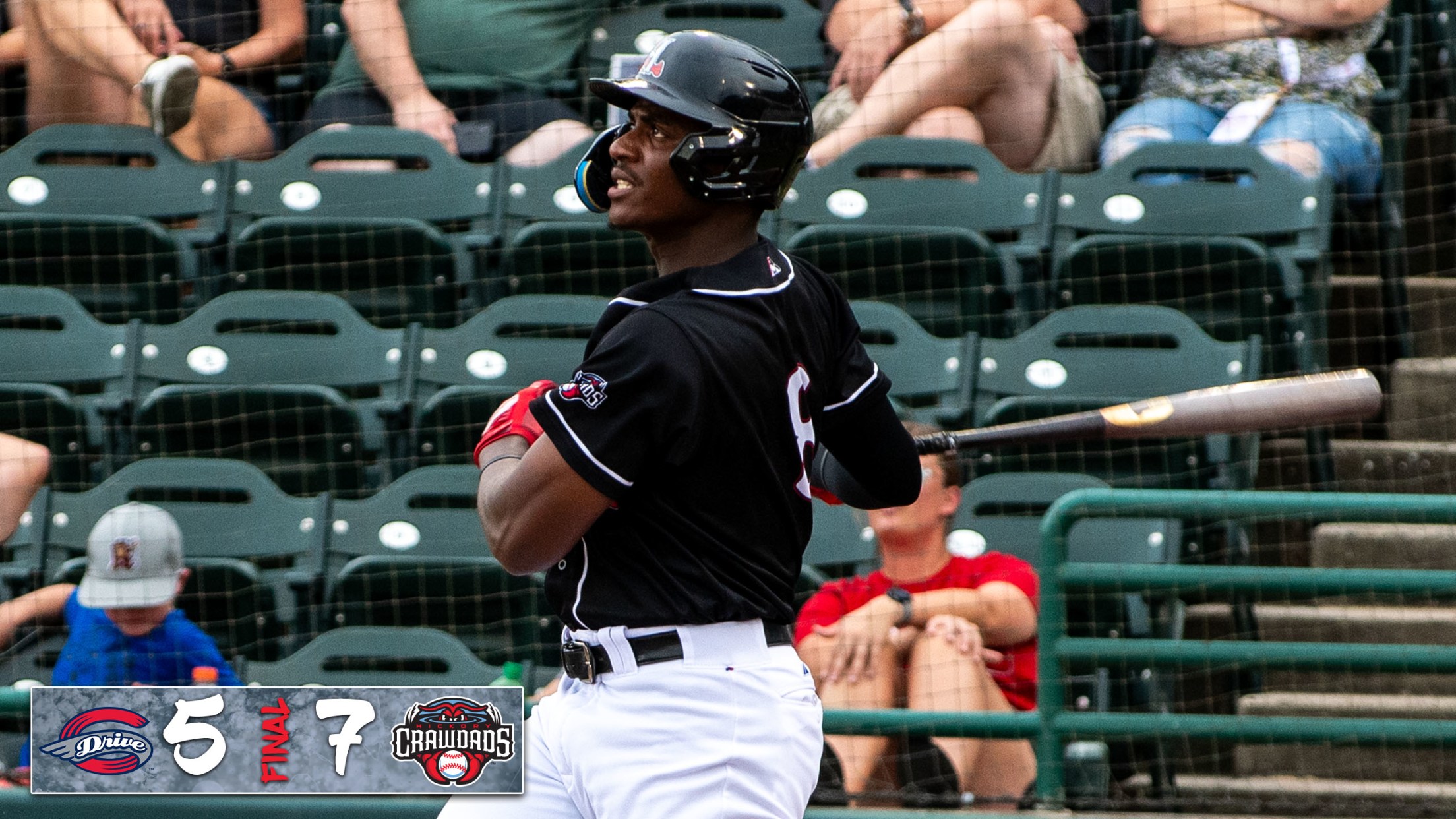 Hickory, NC- The Hickory Crawdads took advantage of ten walks and a Sebastian Walcott home run in the seventh inning to defeat the Greenville Drive at LP Frans Stadium by a 7-5 score on Tuesday night. Trailing 3-2 in the seventh inning, Quincy Scott led the frame off with a
