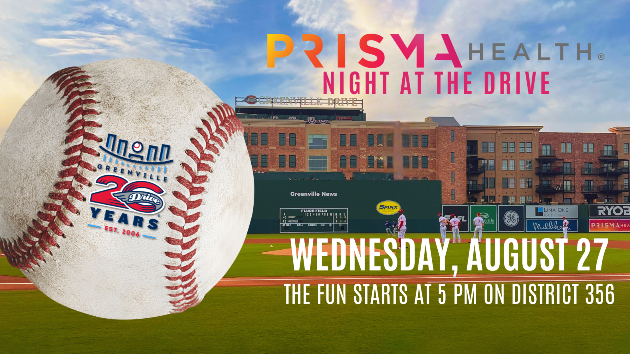 Prisma Health Night with the Greenville Drive – Wednesday, August 27th The Greenville Drive is proud to team up with Prisma Health for a special evening at Fluor Field on Wednesday, August 27th to celebrate our strong partnership and the incredible work Prisma Health does for our community every day.