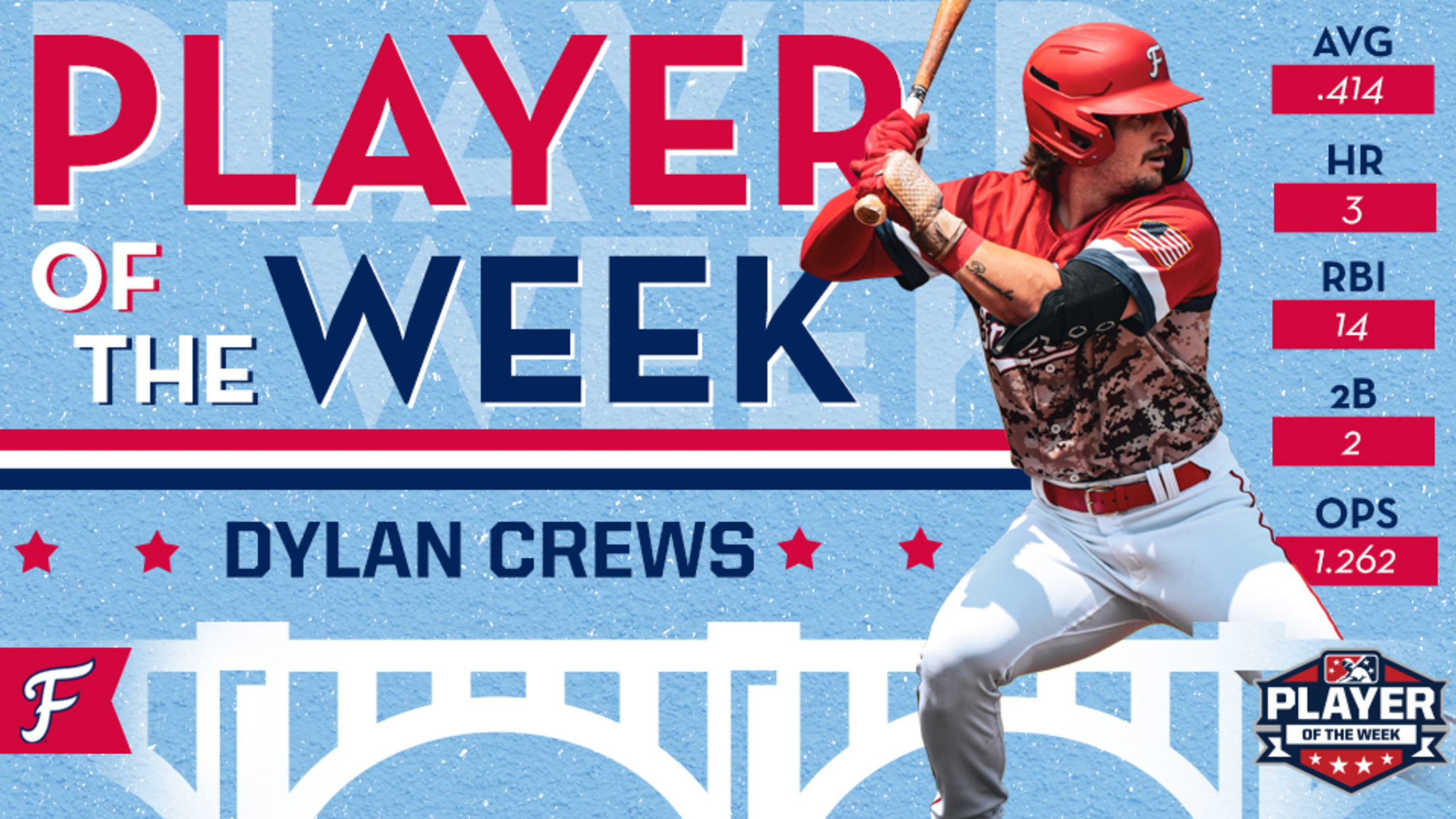 FREDERICKSBURG, VA - FredNat outfielder Dylan Crews has been named Carolina League Player of the Week for the week of August 8-13, Major League Baseball announced today.