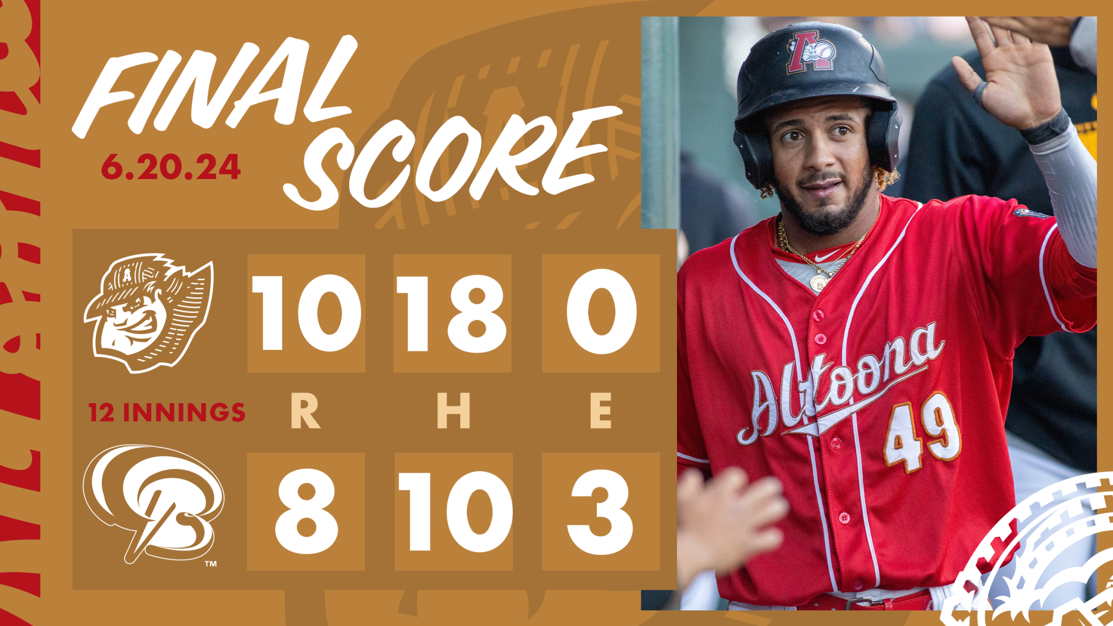 Pichardo stepped up again for Altoona in the 12th inning with a two-run single, advancing to third on an error by Bowie. Hendrie added a second RBI with a single to score him and round out the Curve scoring.