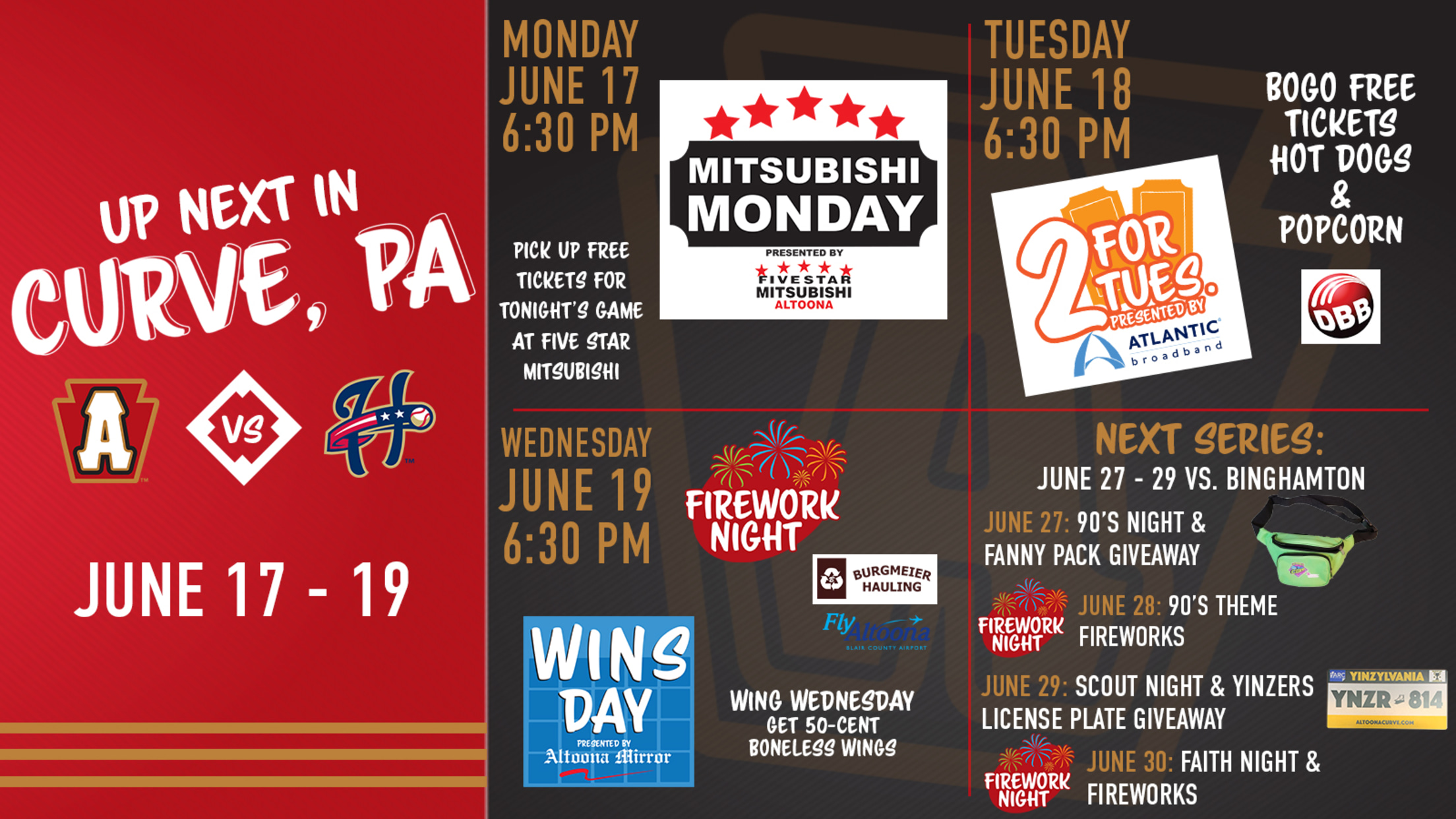 Each game of the series features a daily value promotion, starting with Mitsubishi Monday followed by Two-for-Tuesday, presented by Atlantic Broadband, and ending on Wednesday with a Guaranteed WINsday, presented by the Altoona Mirror.