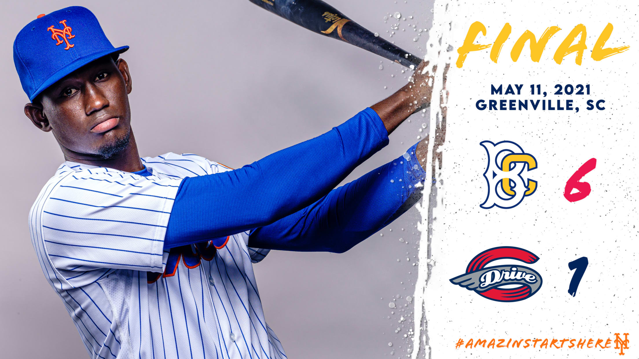 GREENVILLE, SC (May 11, 2021) – Ronny Mauricio homered for the third straight game, Luke Ritter had three hits, and Josh Walker stayed hot to lead the Brooklyn Cyclones, the High-A affiliate of the New York Mets, past the Greenville Drive 6-1 in the series opener Tuesday night at Flour Field.