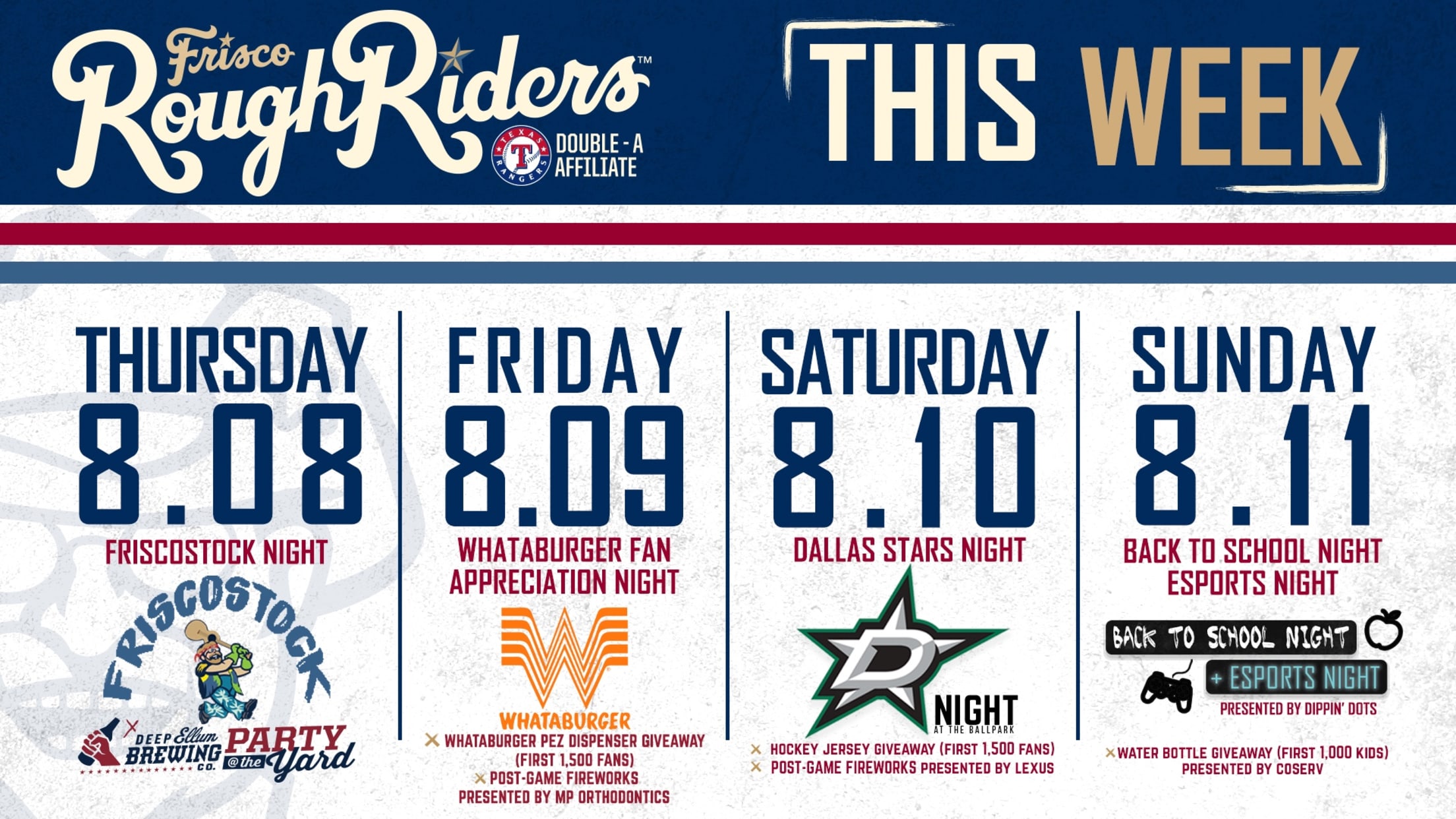 Fans will also be treated to a Woodstock-themed night with Friscostock on Thursday, and the week concludes Sunday with Back To School Night & ESports Night, presented by Dippin' Dots. Plus, free fireworks shows follow the games on Friday and Saturday.