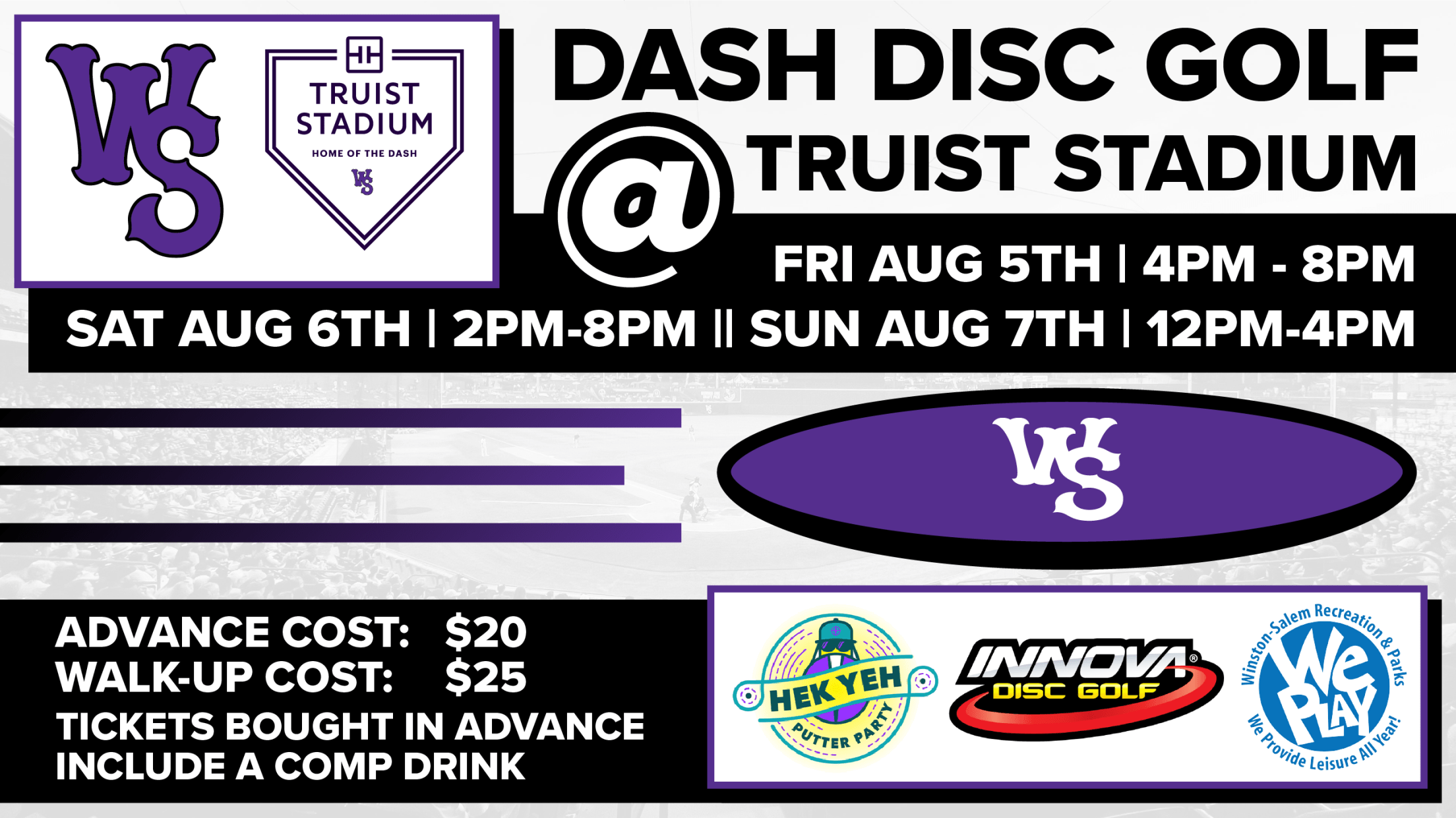 The Winston-Salem Dash have partnered with Hek Yeh Putter Party, City of Winston-Salem Recreation and Parks, and Innova Discs to host Dash Disc Golf at Truist Stadium August 5-7. “Hek Yeh Putter Party” is a premier disc golf/baseball stadium experience and competition designed for first time and experienced players. Participants