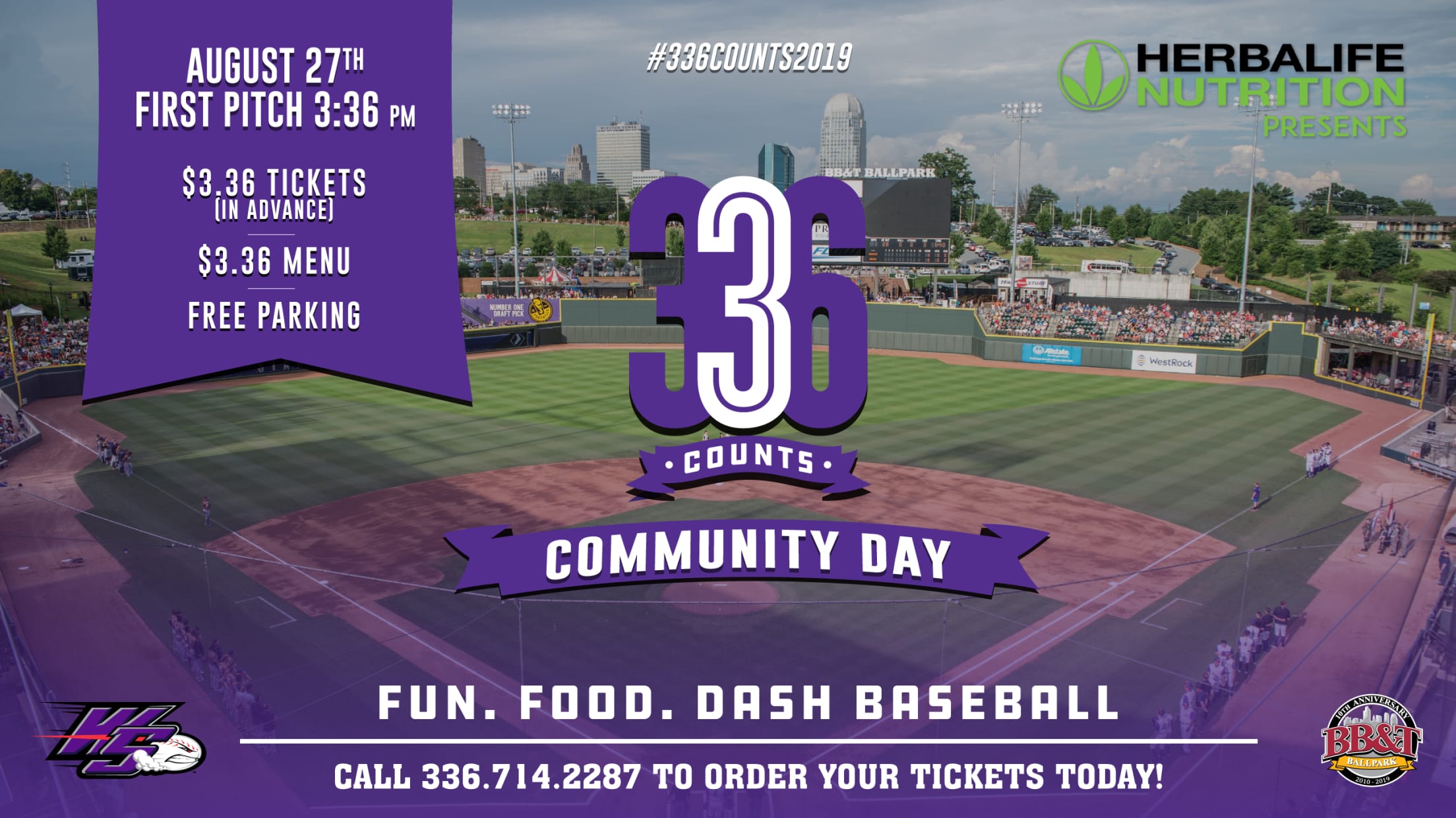 WINSTON-SALEM, N.C. (Aug. 1, 2019) - The Winston-Salem Dash will host the first-ever 336 Counts Community Day, presented by Herbalife, on Tuesday, August 27, when the Dash play the Salem Red Sox at BB&T Ballpark.