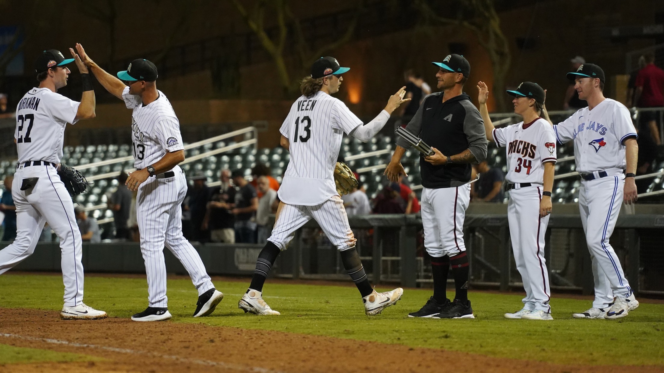Zac Veen (center) and the Salt River Rafters celebrate their first win of the fledgling Arizona Fall League campaign. (Tyler Martin)