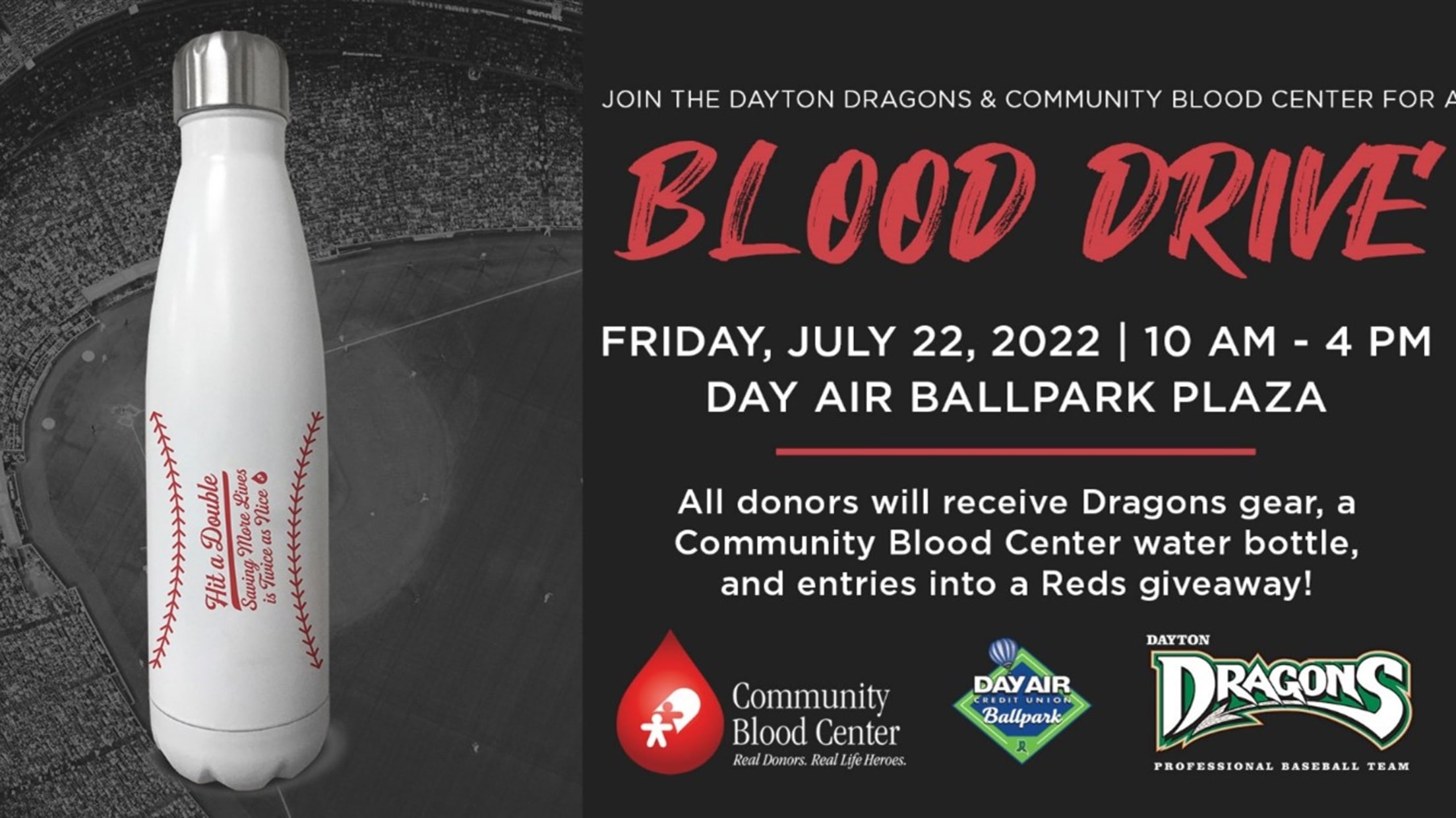 Dayton, Ohio - The Dayton Dragons and Community Blood Center are teaming up for a blood drive on Friday, July 22 from 10 a.m. to 4 p.m. at Day Air Ballpark Plaza. Everyone who registers to donate will receive Dragons gear, an exclusive water bottle from the Community Blood Center,