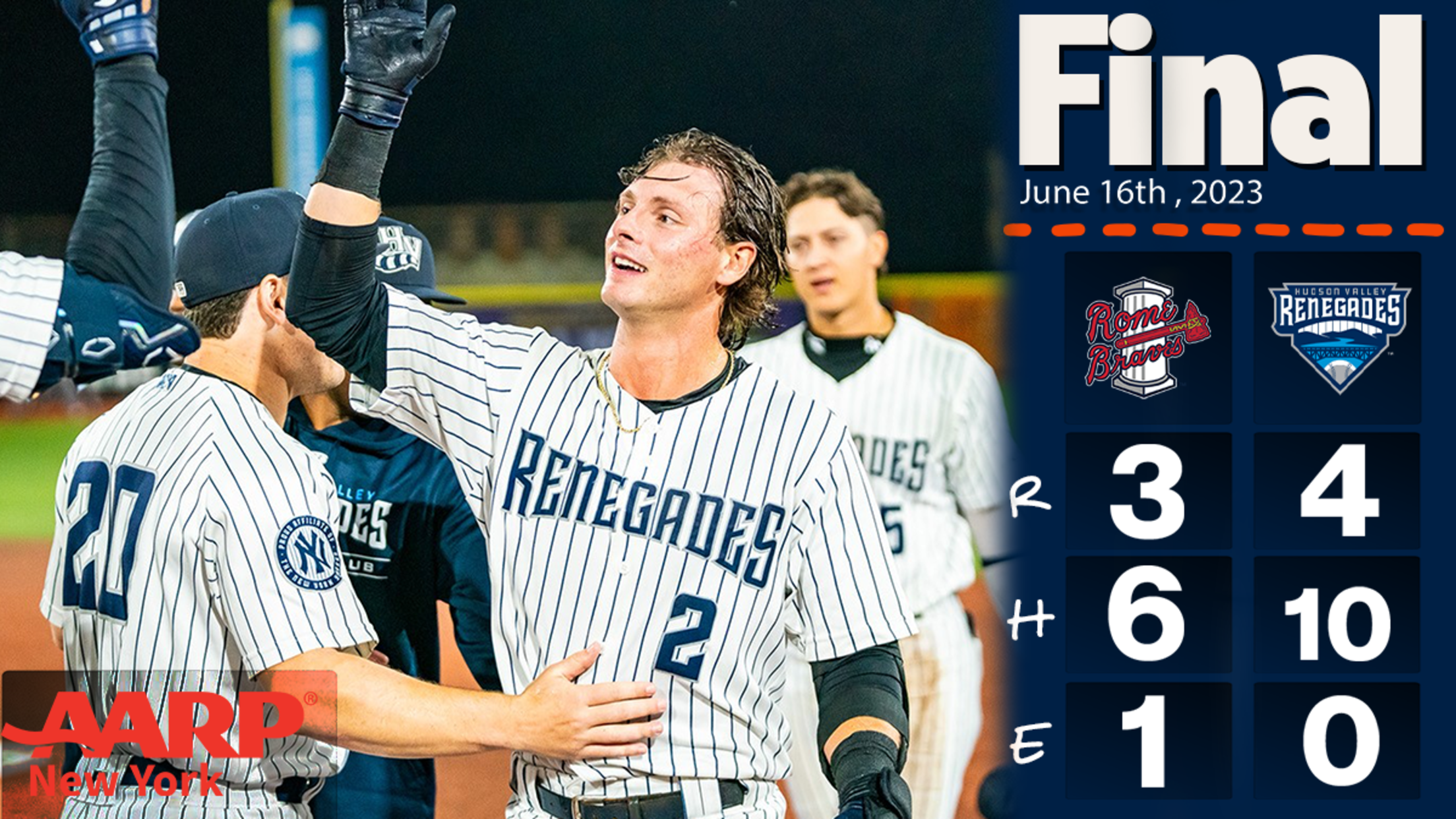 WAPPINGERS FALLS, N.Y. (June 16, 2023) — Ben Cowles delivered a walk-off single in the bottom of the ninth to hand the Hudson Valley Renegades a 4-3 win over the Rome Braves on Friday night at Heritage Financial Park. With a win and a Greensboro Grasshoppers loss, the Renegades pushed