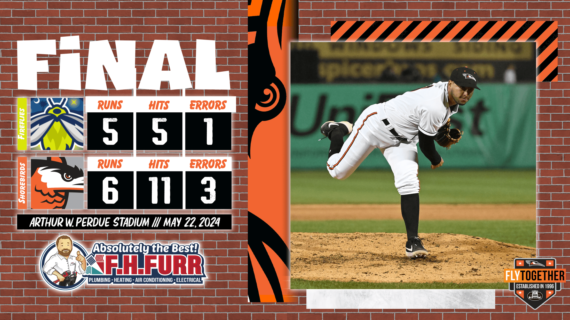 SALISBURY, MD: The Delmarva Shorebirds (14-26) rallied late to win a thriller over the Columbia Fireflies (20-19) by a final of 6-5.
