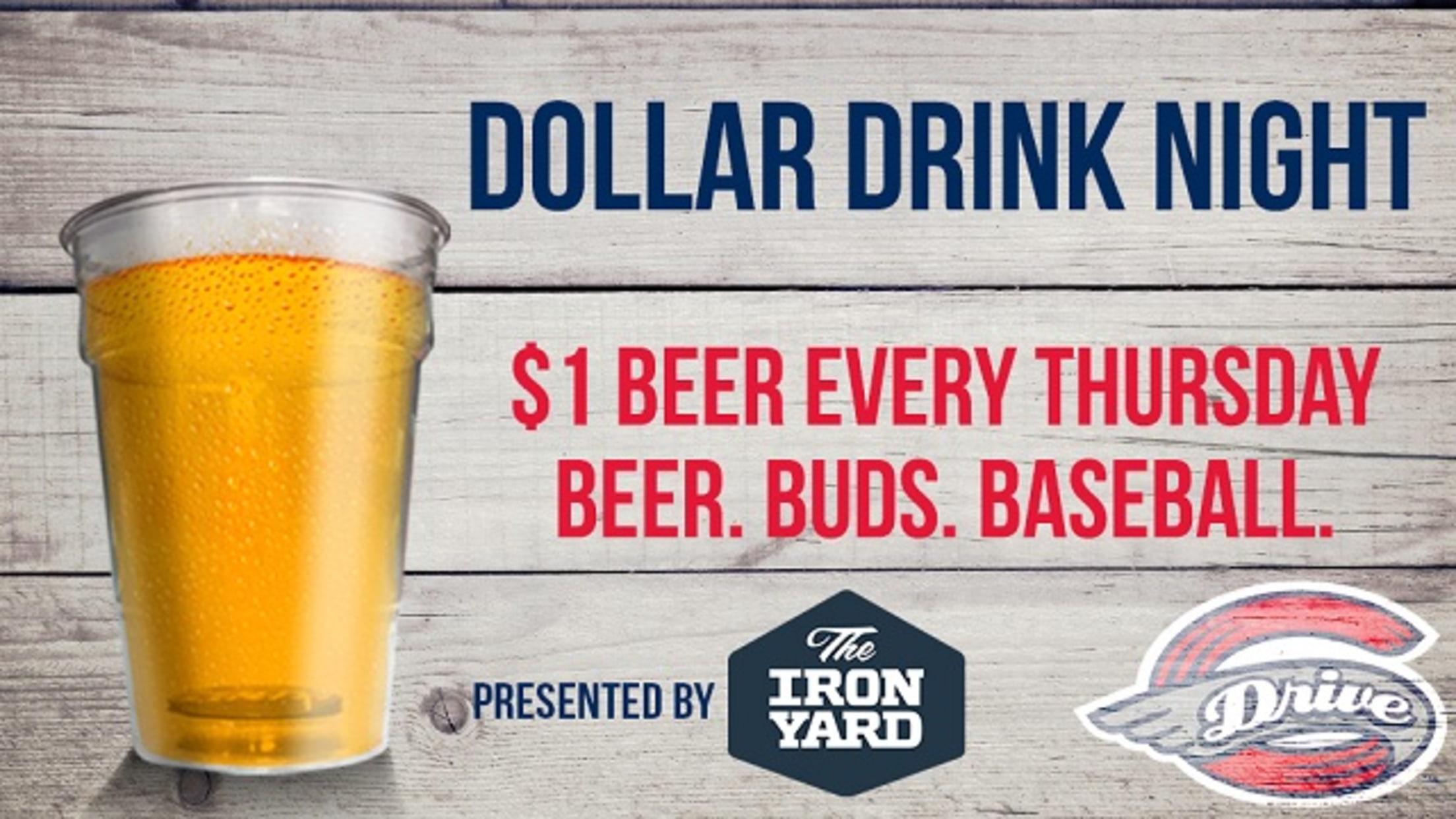 The Drive will host Dollar Drink Night presented by The Iron Yard on Thursday night. First pitch against the Kannapolis Intimidators is at 7:05 PM, and the drink specials begin when the gates open at 6:00.