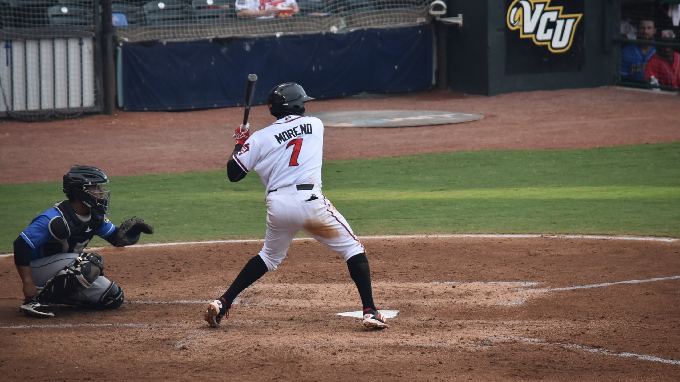 Tied 5-5 in the bottom of the seventh inning, Moreno delivered his fourth game-winning hit of the season, lifting Richmond to victory in game one Sunday. Moreno, who entered in the sixth inning for an injured C.J. Hinojosa, hobbled out of the batters box towards first while scoring