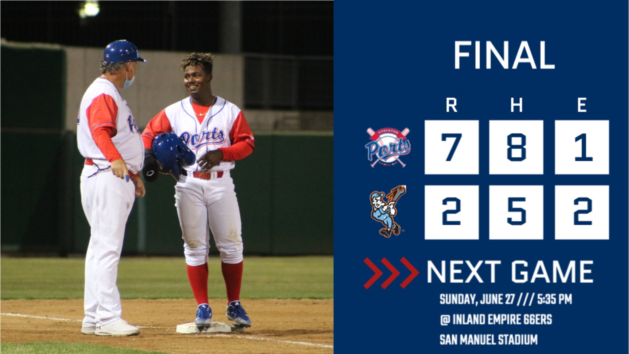 SAN BERNARDINO, Ca. - Down 2-1 with two outs in the ninth inning, the Ports sent eight batters to the plate to score six runs en route to a 7-2 victory over the Inland Empire 66ers at San Manuel Stadium on Saturday night.