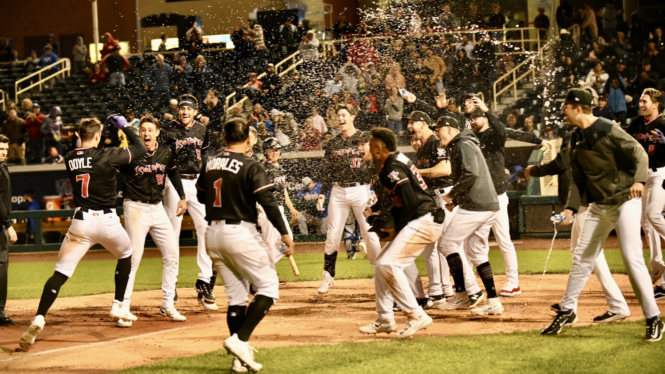 Albuquerque, NM – With the game tied, 3-3, Brenton Doyle led off the bottom of the ninth inning and sent a 2-2 pitch 429 ft. to center field to complete the Isotopes first walk-off win, 4-3, of the season Friday night at RGCU Field.