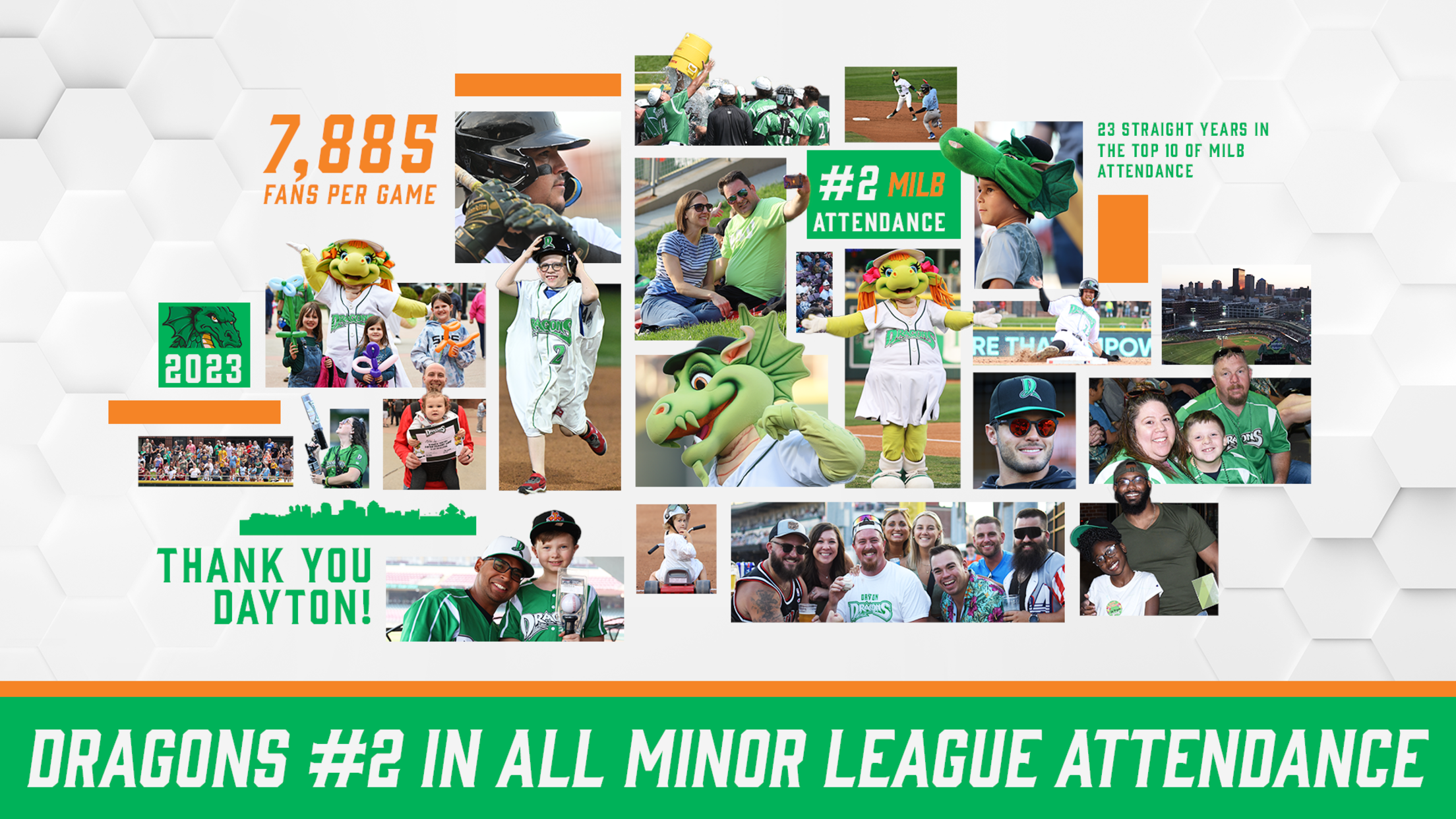 Dayton, Ohio—Minor League Baseball™ (MiLB™) today announced the final attendance rankings for the recently-completed 2023 season. The Dayton Dragons finished the year with a per-game attendance average of 7,885 to rank second in all Minor League Baseball. The Dragons finished with an attendance total of 520,433 over 66 home dates.