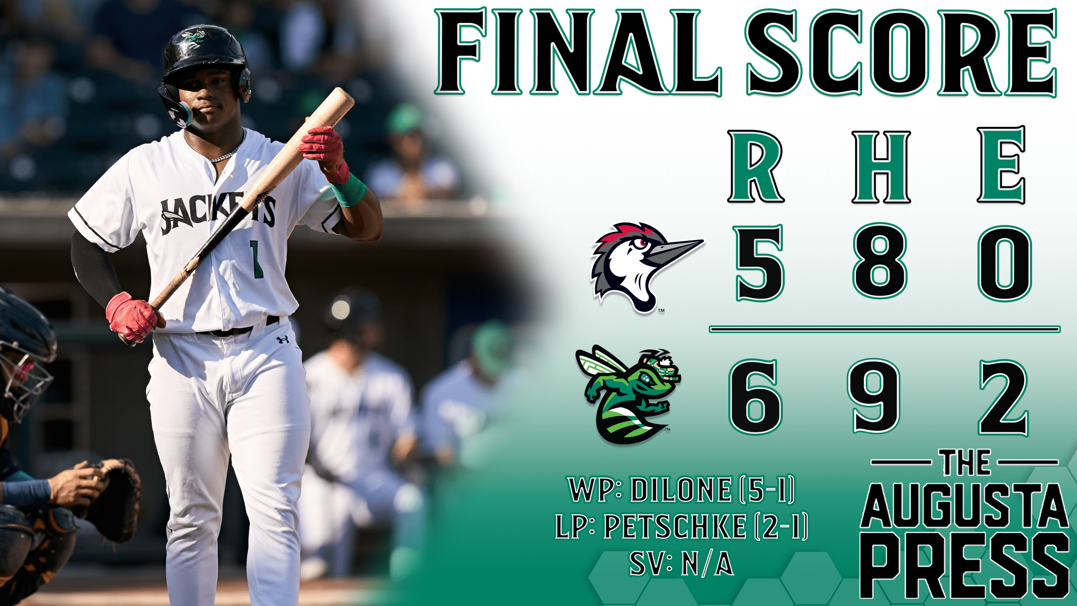 The GreenJackets entered the 9th needing just one run for their 4th walk off of the year, and the barrage of walks continued as Ben Petschke issued free passes to Cam Magee and Jacob Godman to start the 9th. After a lineout and double steal put men at 2nd and 3rd, Petschke intentionally walked Gonzalez to load the bags and create a force. Figueroa would pop out on the first pitch of the at bat, setting the stage for Isaiah Drake. Drake entered on an 0-4 day with 3 strikeouts, but erased everything else from the day with a line drive over the 3rd base bag for a base hit that scored Magee and handed Augusta a series-opening victory 6-5.