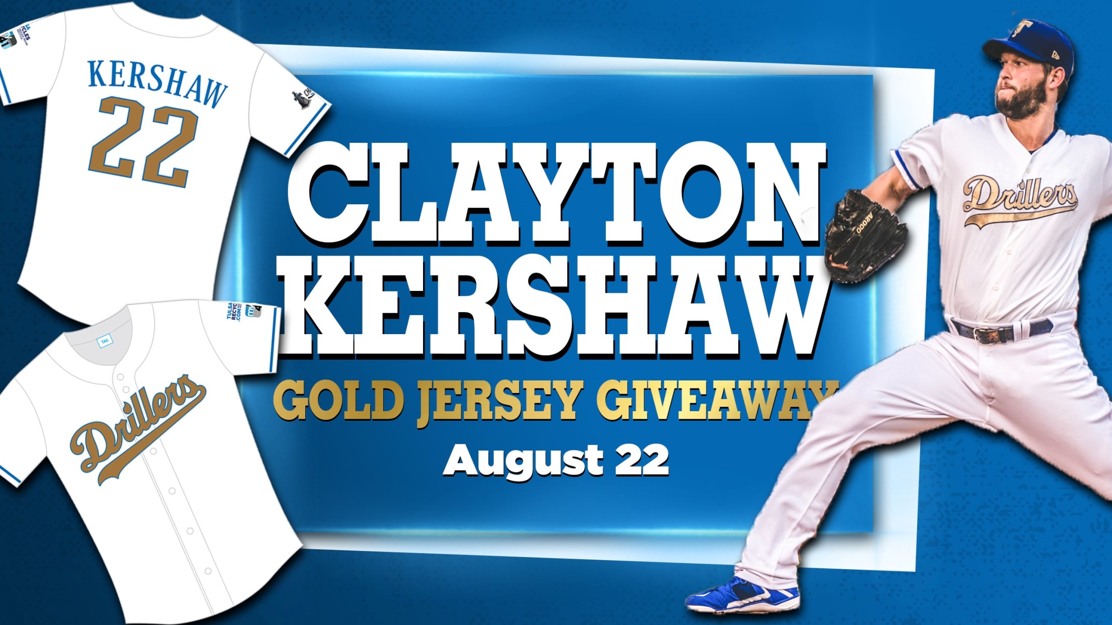 To commemorate this historic appearance, the Drillers announced today that Thursday, August 22, 2019 will be Clayton Kershaw Jersey Night at ONEOK Field. The first 1,500 fans to enter the stadium that evening will receive a Drillers, Gold Clayton Kershaw jersey, just like the one he wore in his rehab appearance.