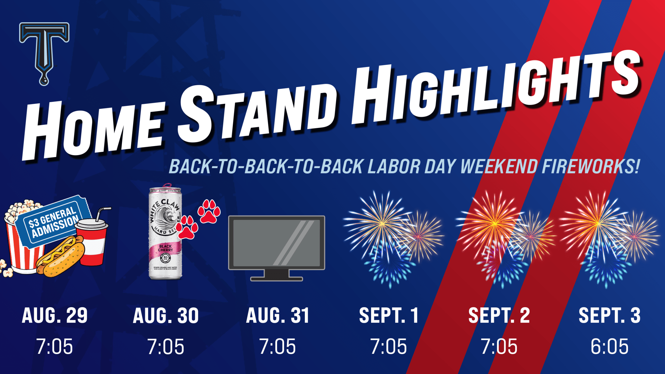 The home stand will open on August 29 with $3 T-Town Tuesday, featuring $3 tickets on the Kia Ferguson Lawns and $3 brats, popcorn and souvenir sodas. Tickets in the main seating bowl can be purchased for just $9.18 each.
