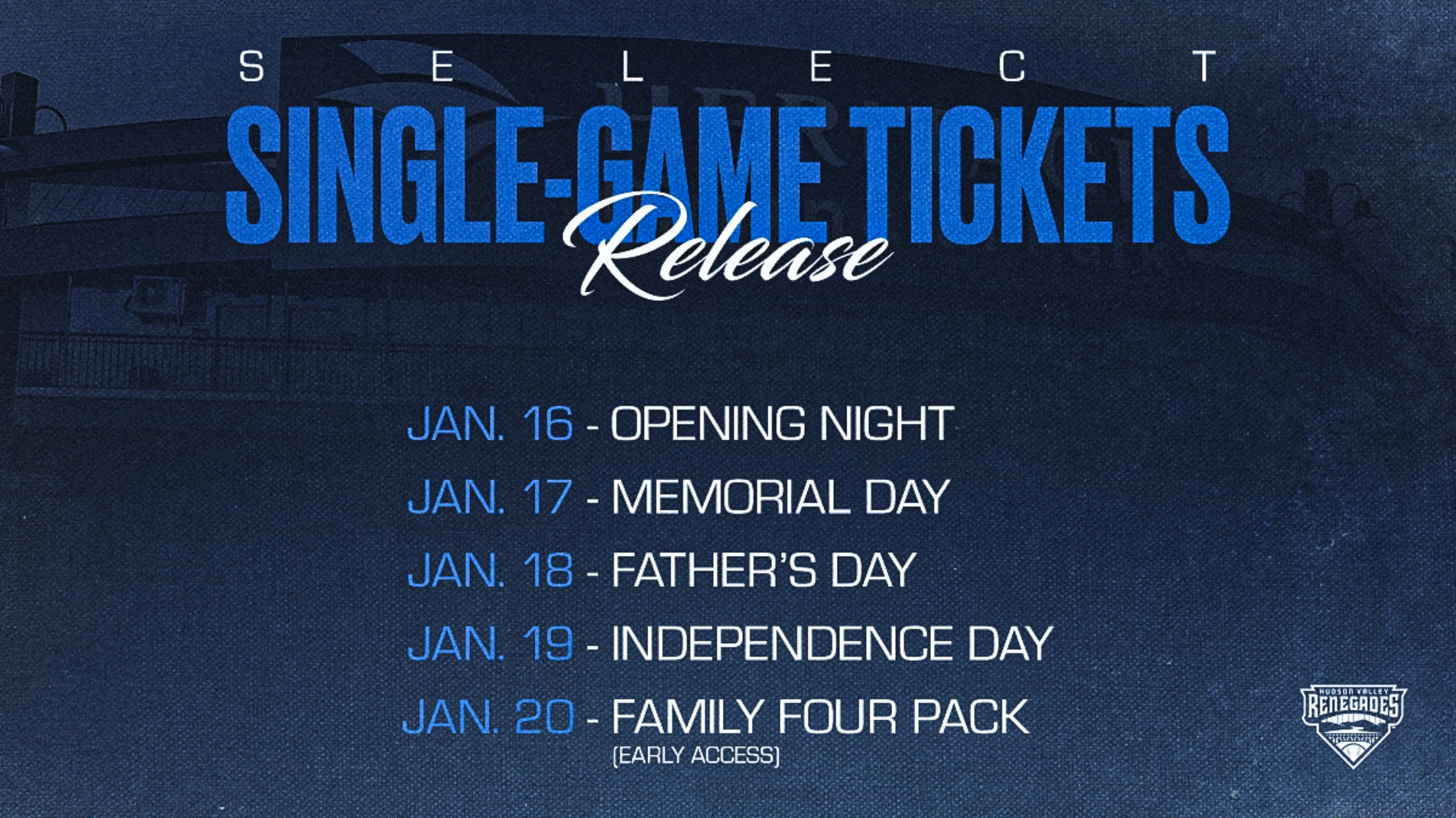Fans can purchase their tickets online by clicking here, by calling the Renegades Ticket Office at (845) 838-0094, or in-person at Heritage Financial Park.