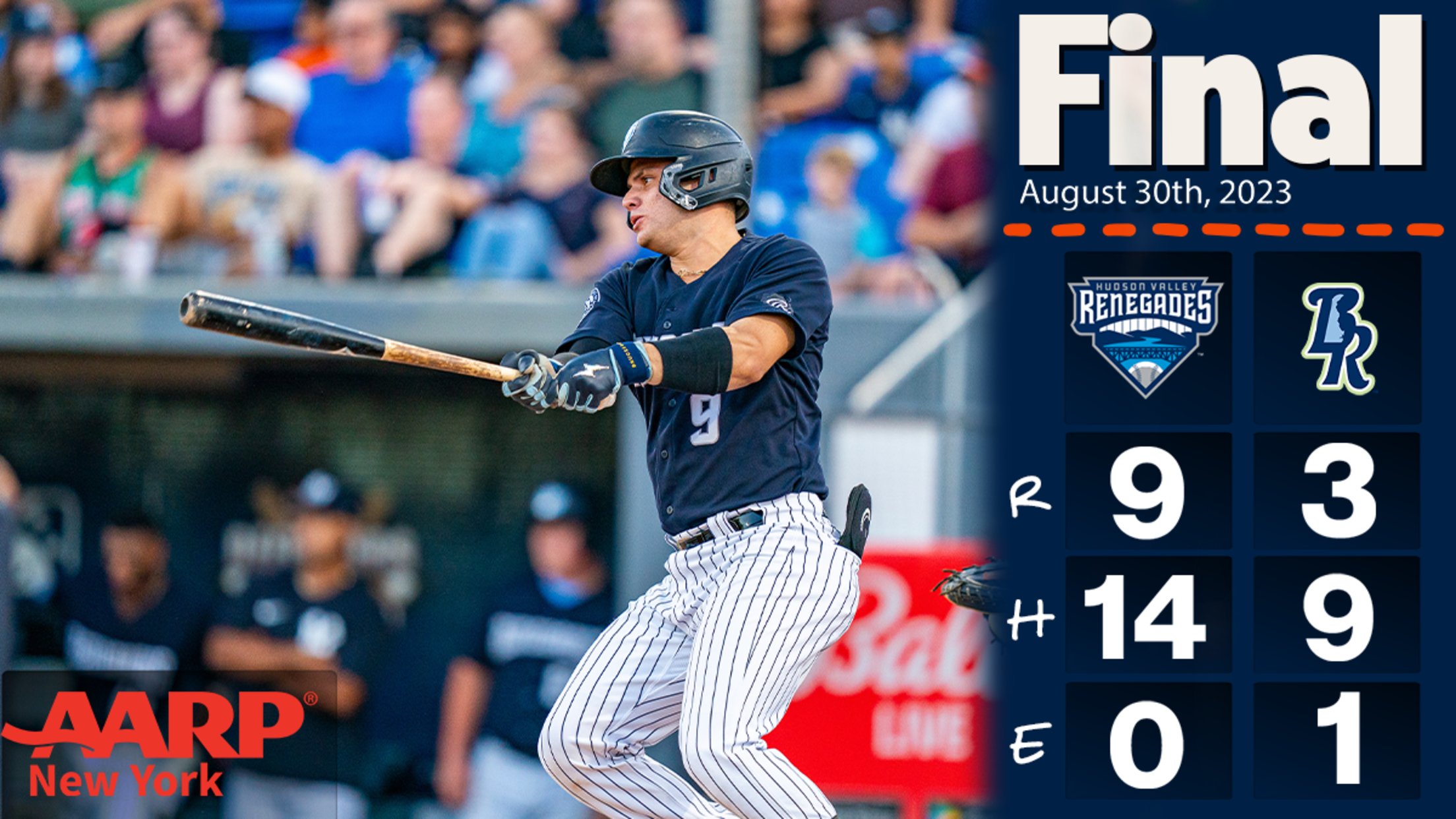 Wilmington, Del. (Aug. 30, 2023) — The Hudson Valley Renegades offense slugged 14 hits in a 9-3 victory over the Wilmington Blue Rocks on Wednesday night at Frawley Stadium.