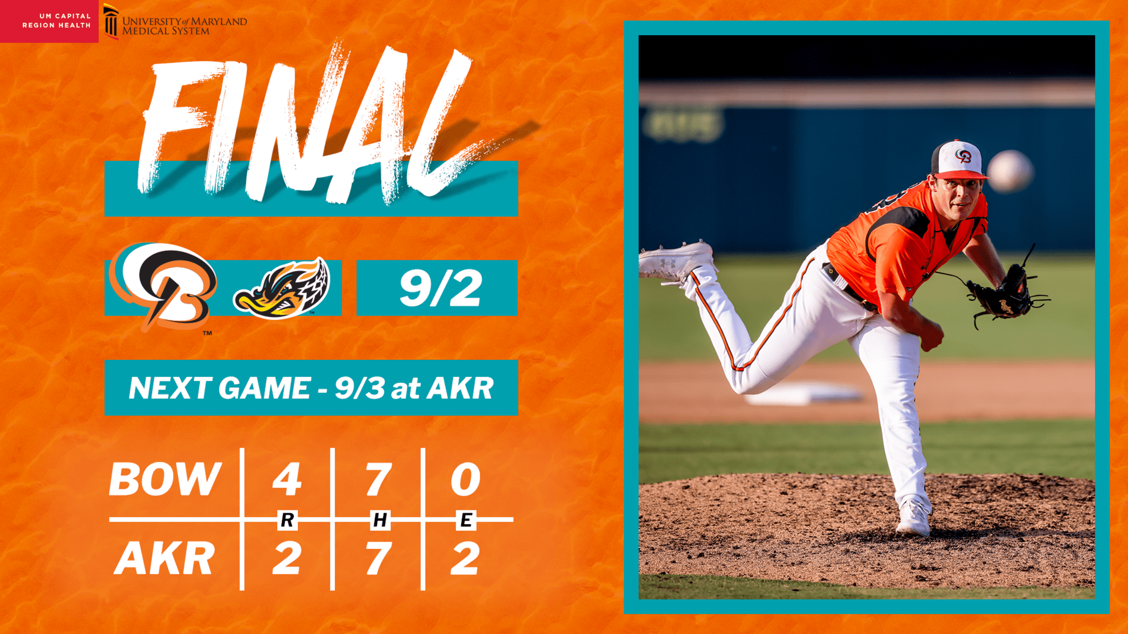 BOX SCORE AKRON, OH – A tension-filled night at Canal Park on Saturday, the Bowie Baysox were able to break their brief two-game skid against the Akron RubberDucks. Thanks to an early home run by Jud Fabian, Bowie never trailed, and used strong pitching to hold on to a 4-2